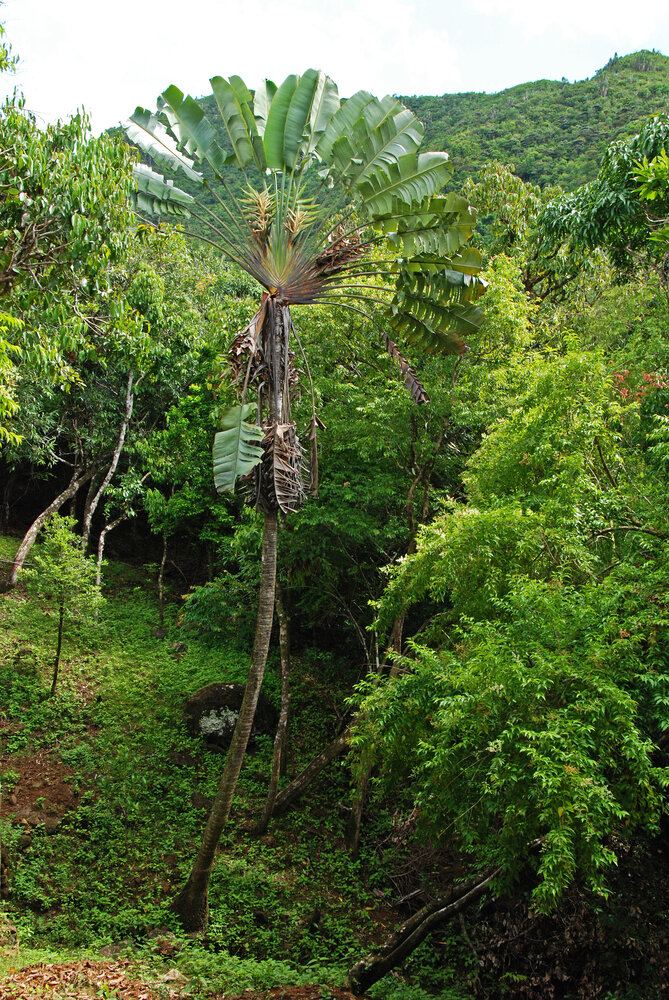 Ravenala cf. madagascariensis, unusual single stemmed tall individual, Ferney, Mauritius, photo Patrick Blanc