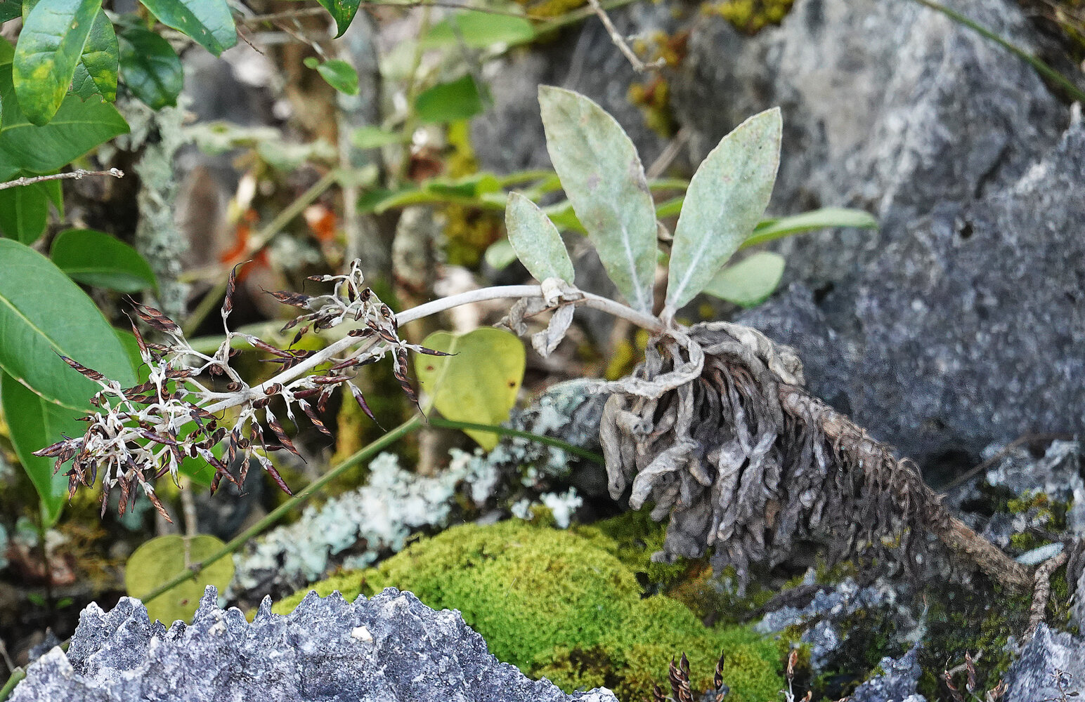 Paraboea cf. mataensis, almost cryptic on the vertical karst cliff due to the silvery white colour of the densely hairy leaves similar to the greyish white colour of the eroded rocks, Buntu Burake Makale, South Sulawesi