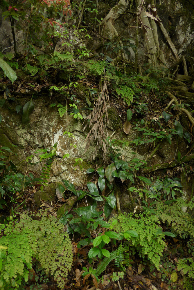 Microsorum whiteheadii population on its vertical limestone habitat with a big Adiantum, Payakumbuh, West Sumatra