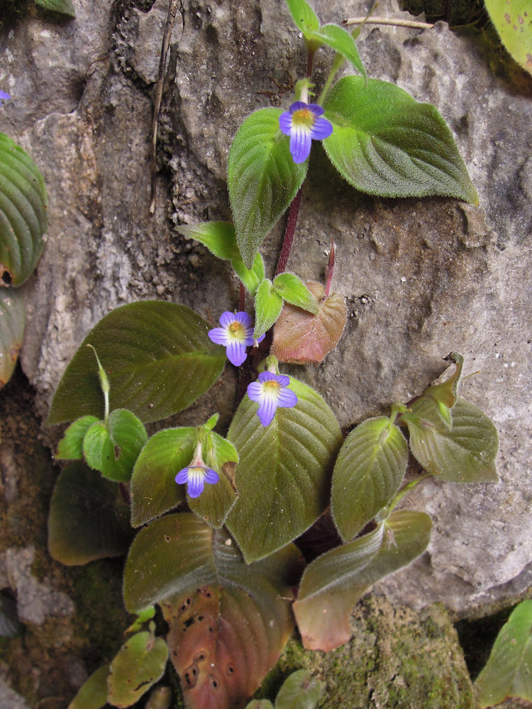 Microchirita caliginosa, population flowering on vertical seeping limestone rock, Krabi, Thailand