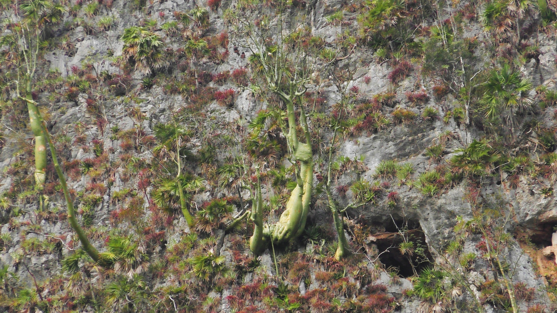 Pachira (syn. Bombacopsis) cubensis, Leucothrinax morrisii and Hohenbergia penduliflora populations on vertical limestone cliff of the mogotes, Valle de Vinales, Cuba