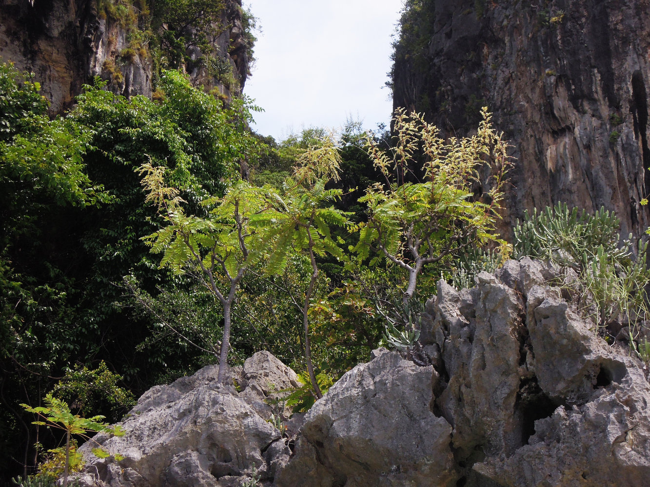 Phyllanthus mirabilis, branched apical inflorescence of arborescent individuals at the top of a karst outcrop along seashore, Railay, Krabi, Thailand