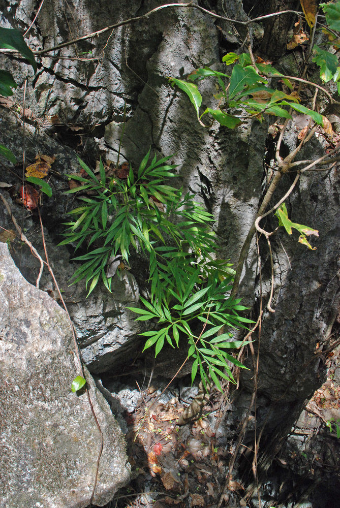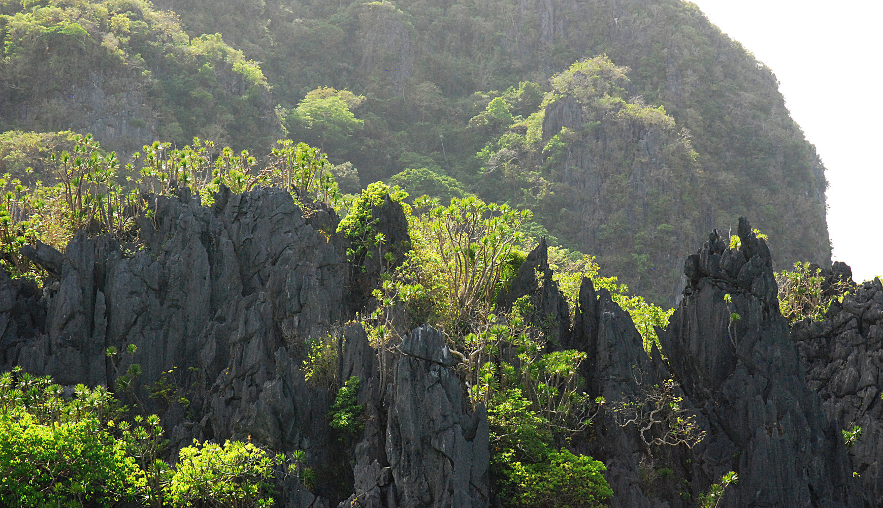 Adonidia merrillii and Dracaena multiflora under windy conditions on vertical karst islet, El Nido, Palawan, Philippines