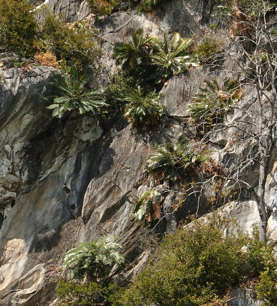 Cycas clivicola population on vertical limestone cliff, Batu Putih island, Temenggor dam lake, Perak, Malaysia