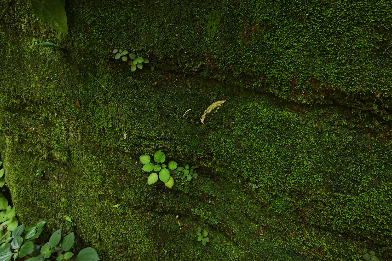 Streptocarpus (syn. Saintpaulia) ionanthus subsp. grotei, two tiny anisocotylous seedlings among mosses and hepatics on vertical rock face, Emau Hill, Amani, East Usambara, Tanzania