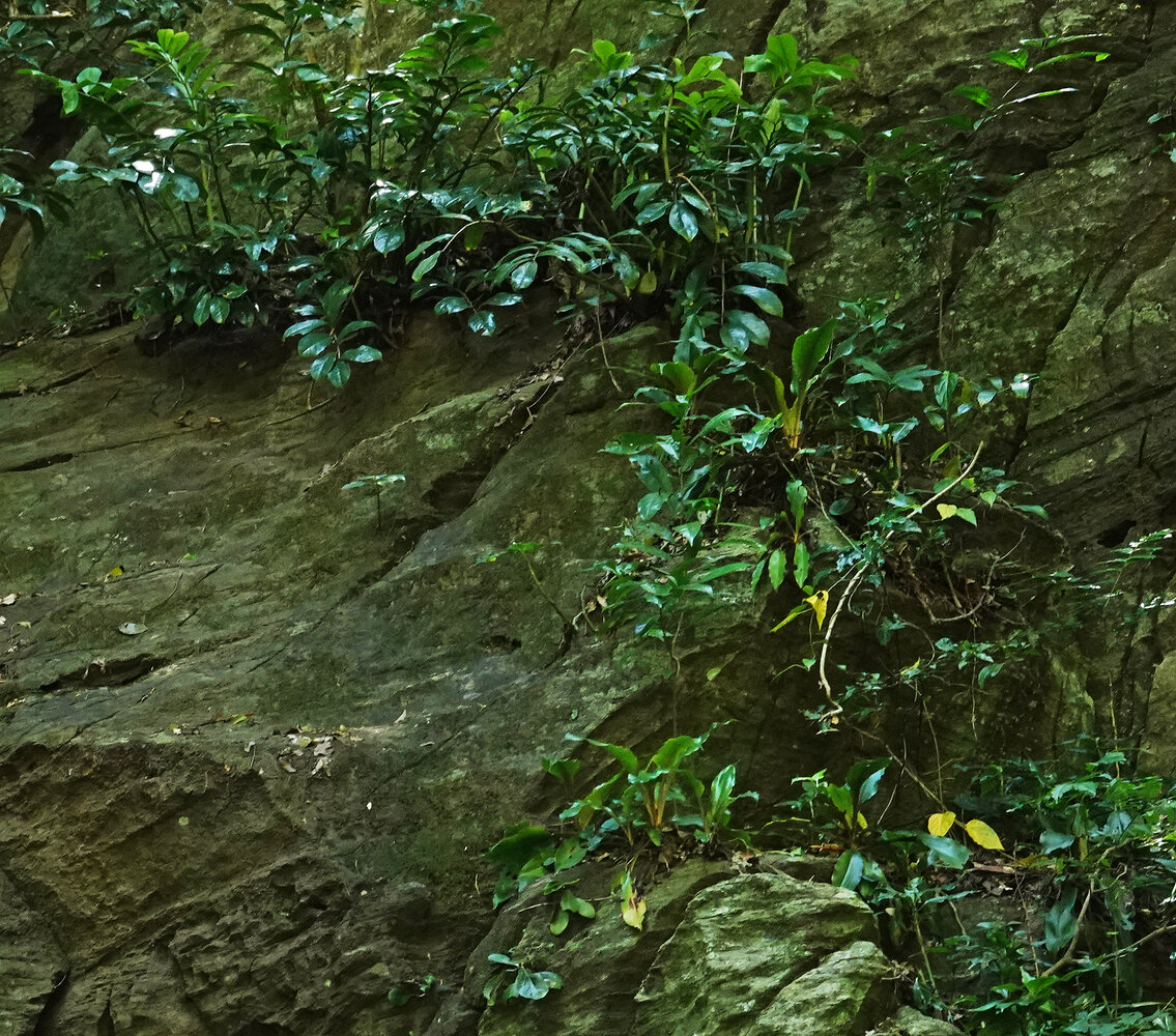 Zamioculcas zamiifolia, Chlorophytum filipendulum subsp. amaniense and Kalanchoe sp. on vertical forest understory cliff, Amani, 400 m asl, East Usambara, Tanzania