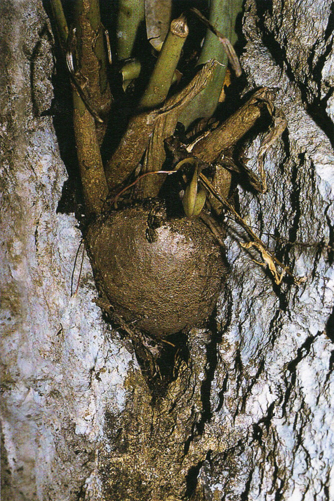 Zamioculcas zamiifolia, base of a plant in rock fissure, the base of petioles are persisting as water storage organs just under an abscission circle, Amani at 300 m asl, East Usambara, Tanzania