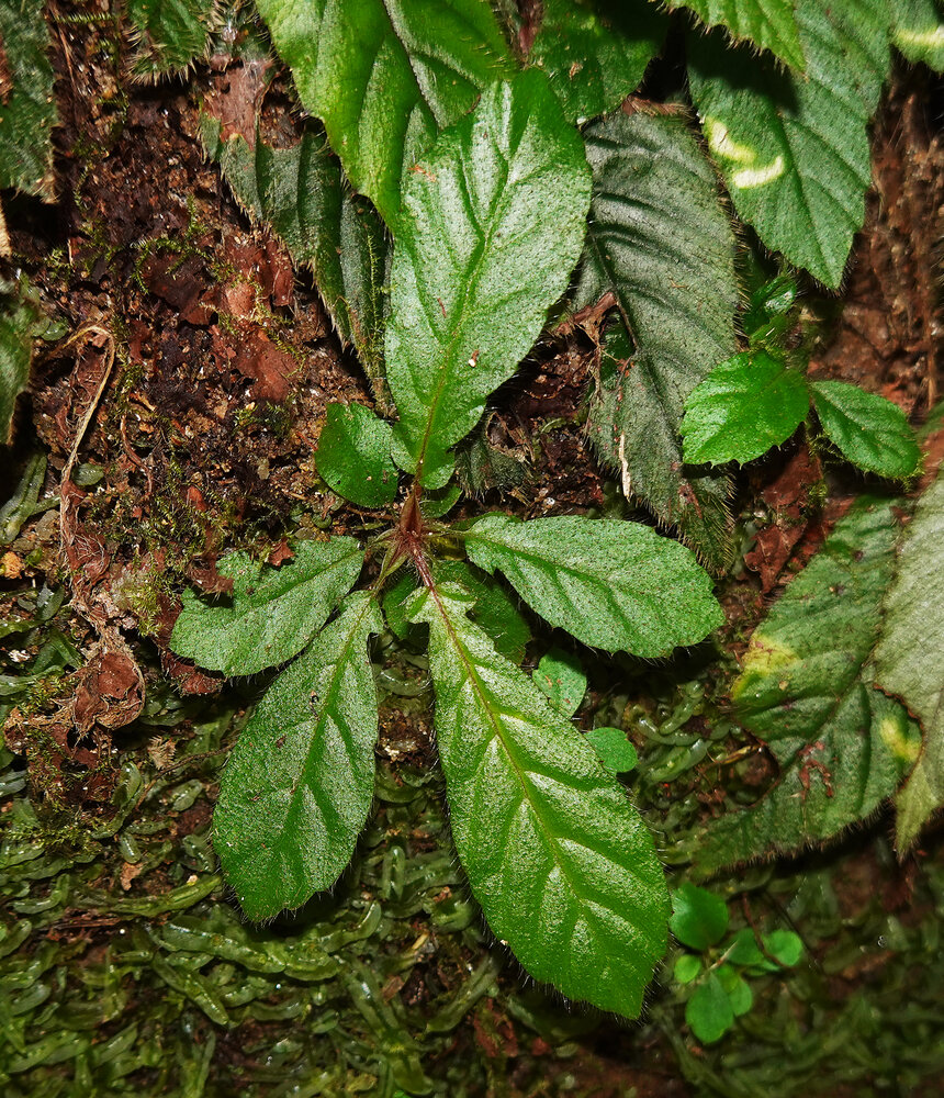 Acrotrema intermedium, adult plant with funnel leaf distribution quite similar to the Malesian Gesneriaceae of the genus Codonoboea growing in the same vertical habitat, Kitulgala, Sri Lanka