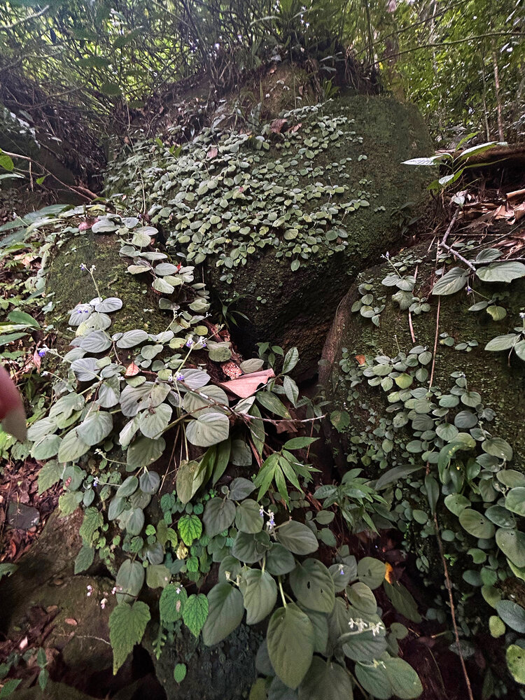 Ridleyandra cf. porphyrantha, flowering population on vertical rocky earth bank with numerous seedlings in the lower part, Kenyir Lake, Malaysia