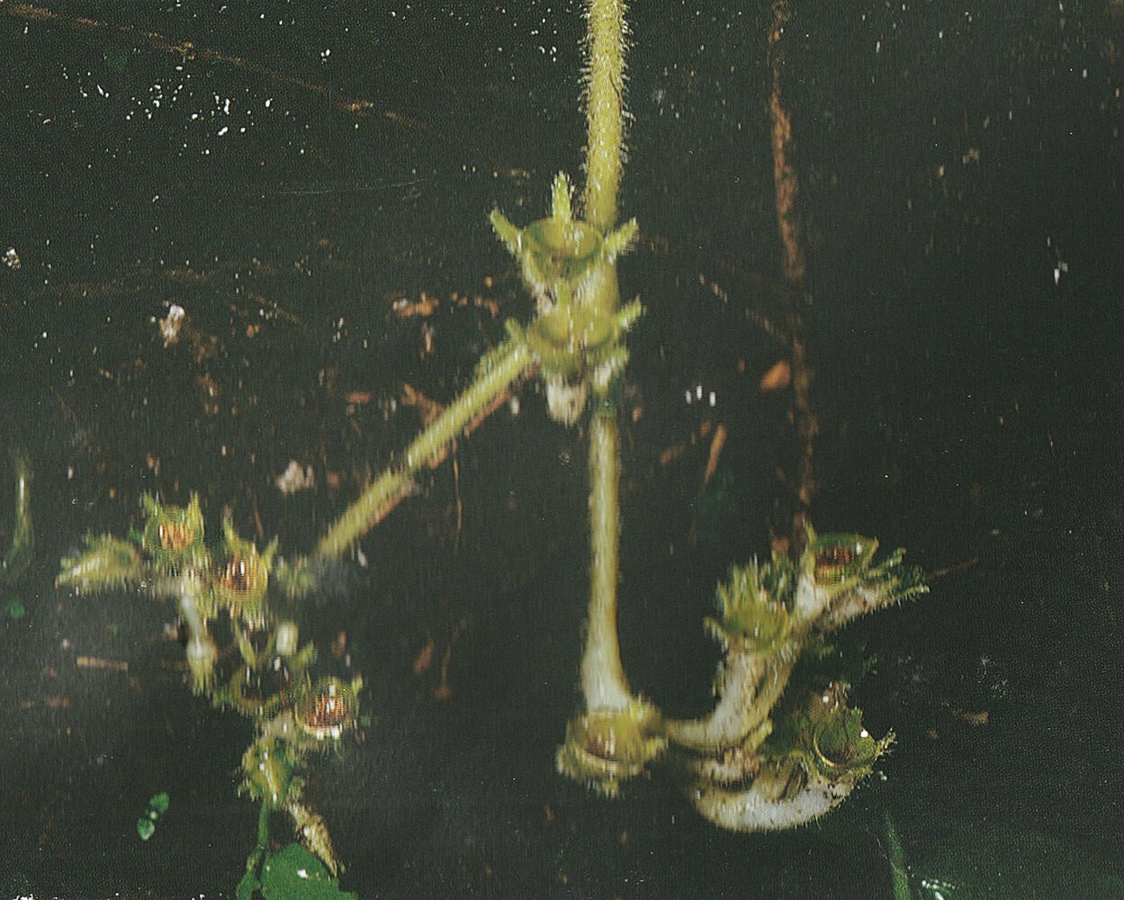Loxocarpus incanus, mature erect rain splash capsules exposing the tiny seeds, Penang Hill, Malaysia, from P. Blanc Etre Plante à l'ombre des forêts tropicales, Nathan, 2002