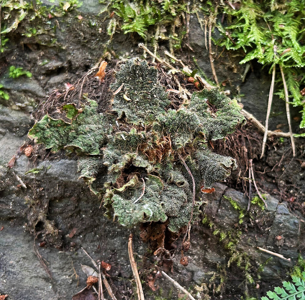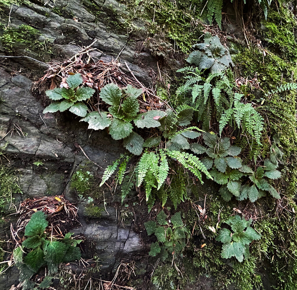 Ramonda myconi and Asplenium fontanum on a mossy shale rock substratum, Andorra