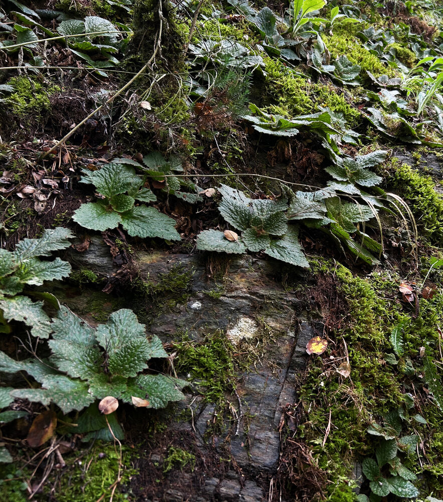 Ramonda myconi, the faintly straightened upper leaves of the rosette are fixing some plant fragments falling from canopy thus creating some basal humus, Andorra