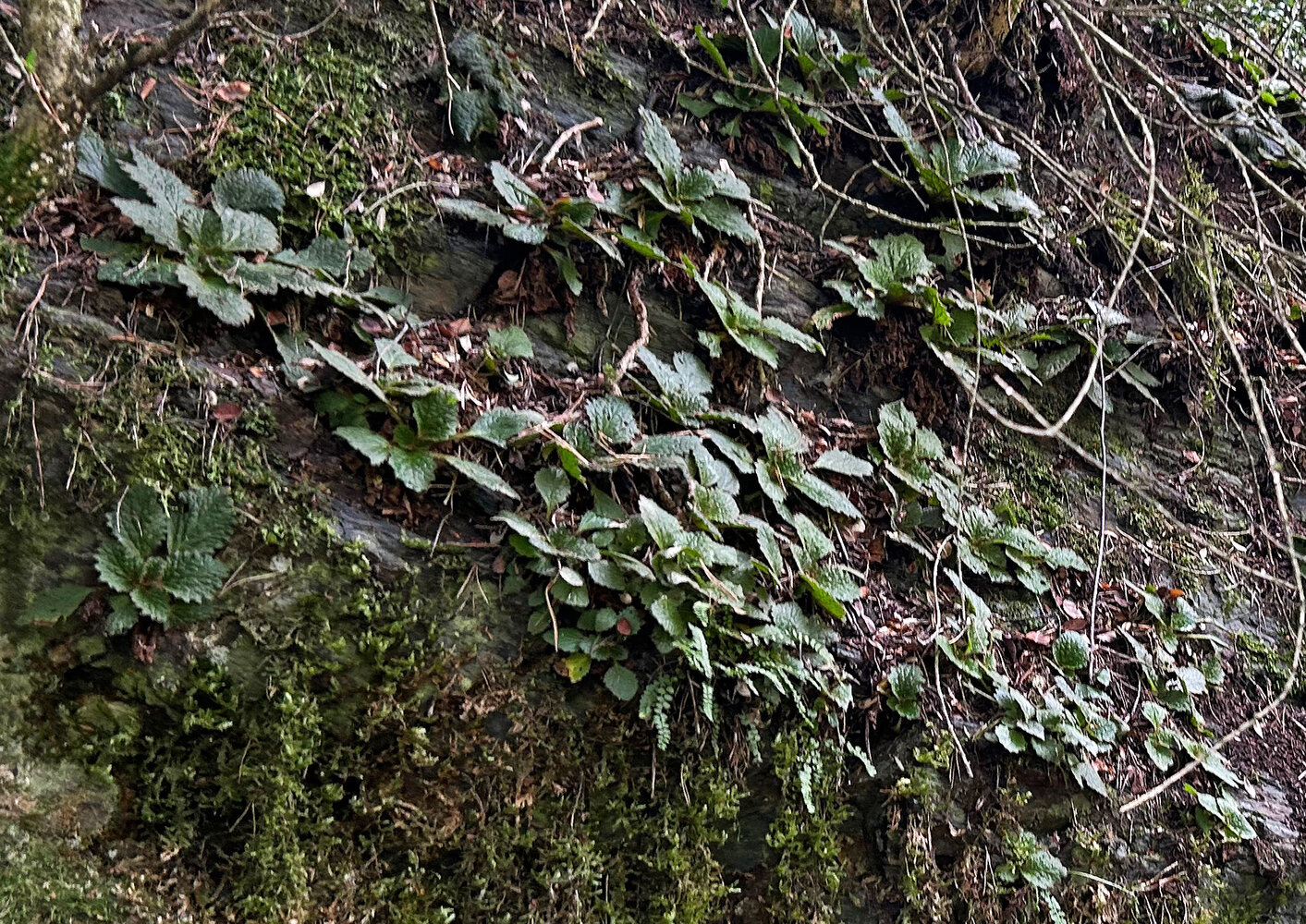 Patrick Blanc and a population of Ramonda myconi on vertical mossy shale rock faces, Pyrenees at 1200 m asl, Andorra, July 2025