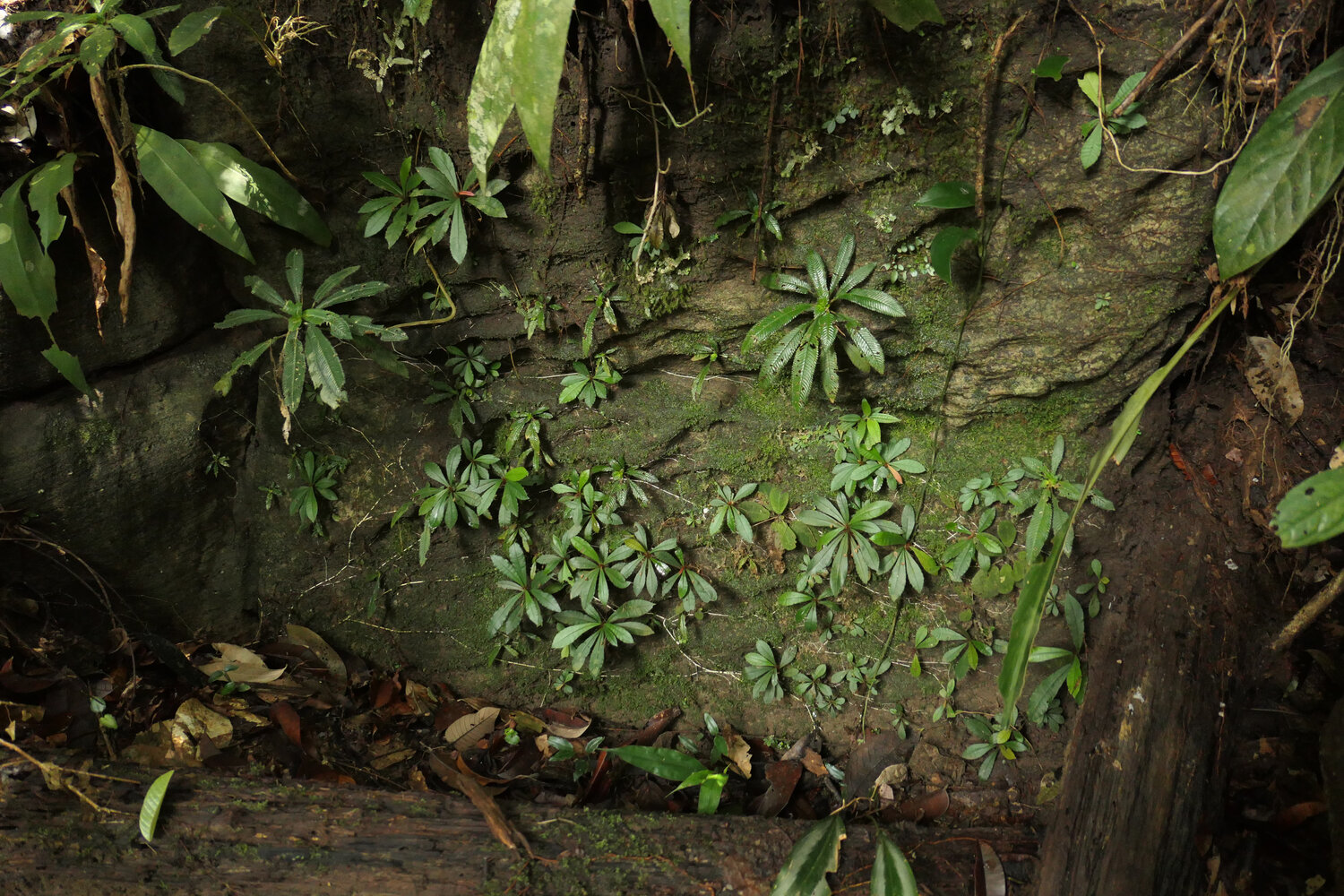Codonoboea craspedodroma, old individual with leaves rosette ending a naked woody stem, on the vertical face of a rock in a protected forest canyon, Endau Rompin NP, Malaysia