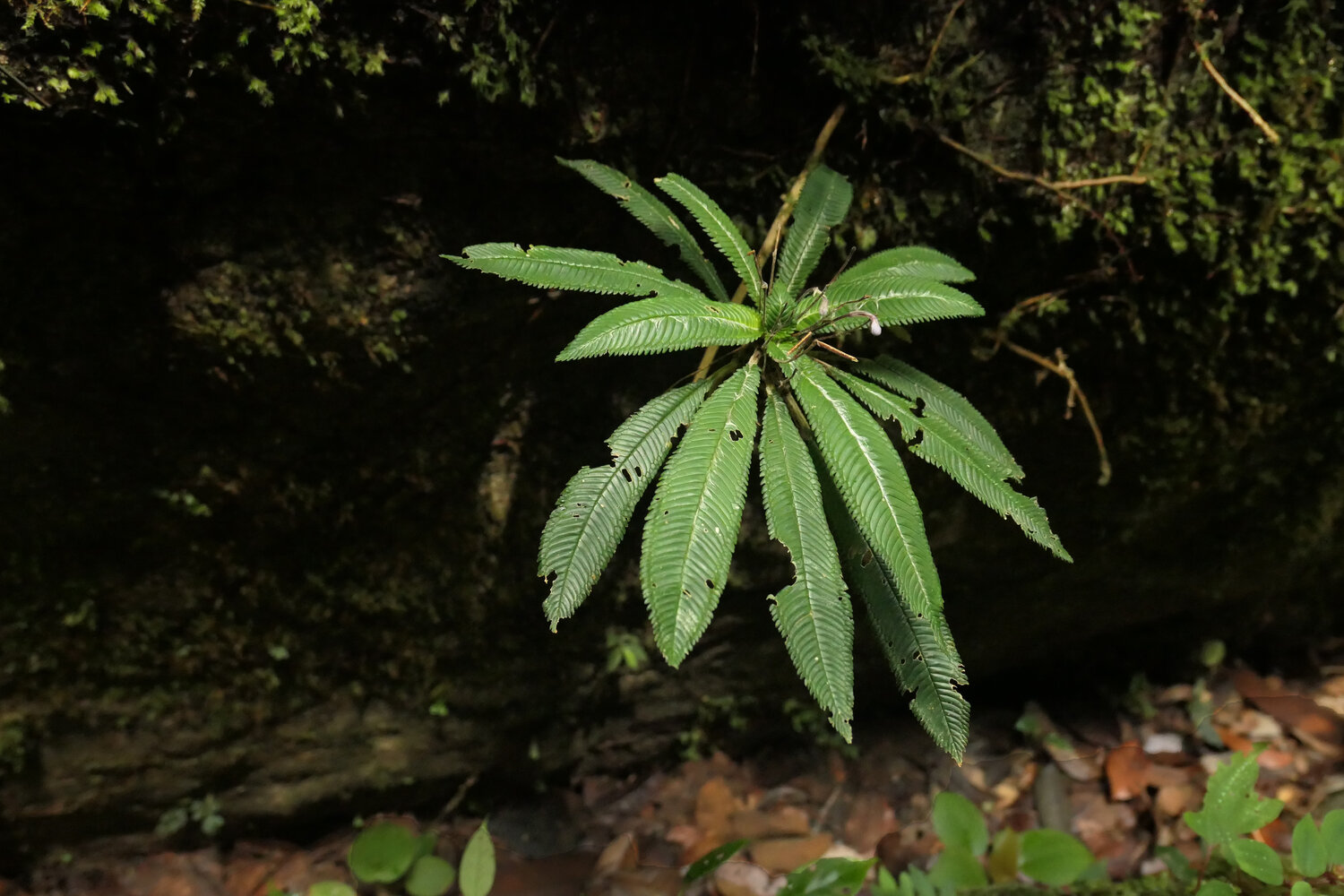 Codonoboea puncticulata, Neckia serrata, Diplazium tomentosum and Selaginella intermedia growing on the vertical face of a small rock, Endau Rompin NP, Malaysia