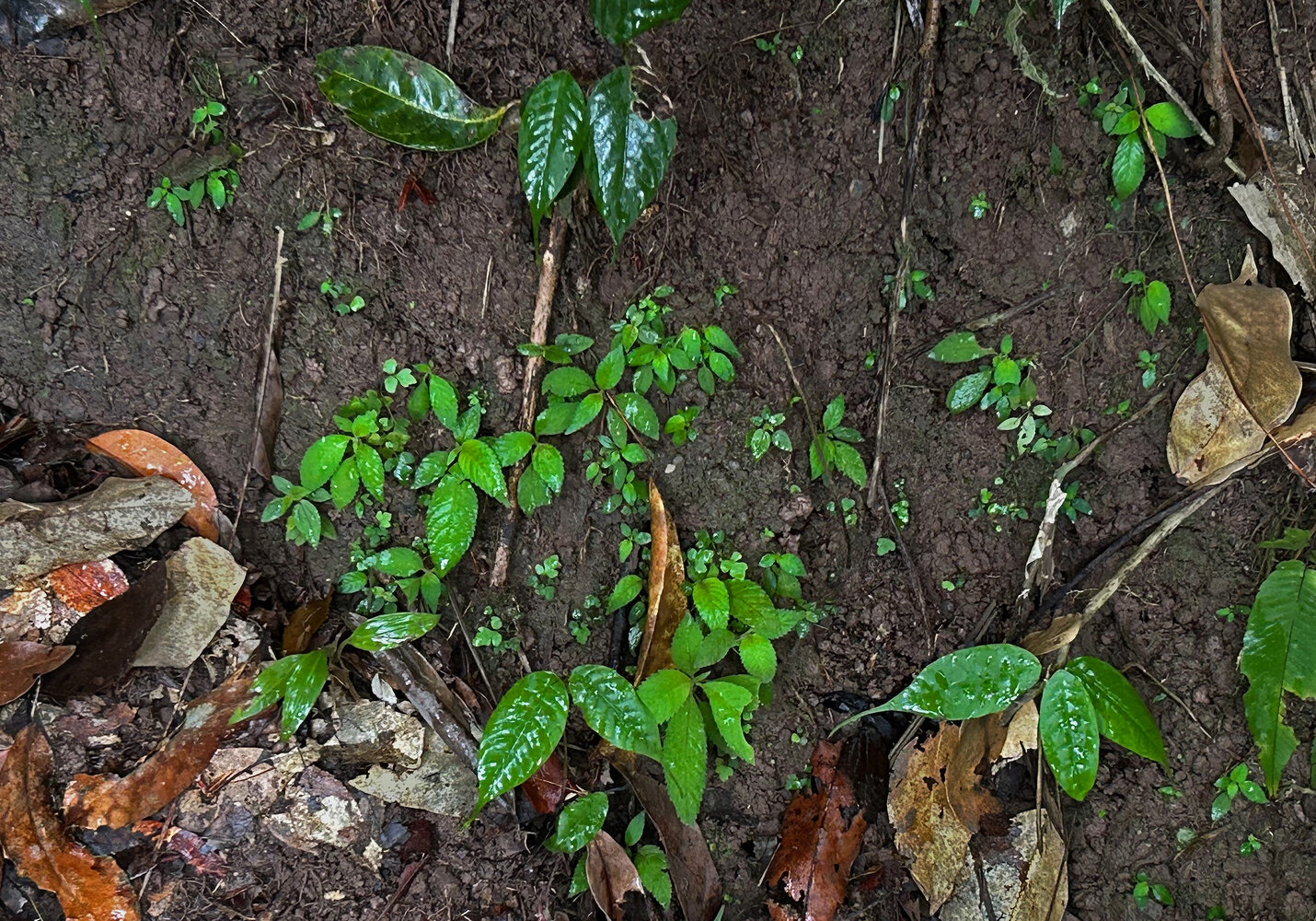 Codonoboea lilacina, seedlings on vertical earth bank devoid of litter thus allowing successful germination of the tiny seeds, Tahan river, Taman Negara, Malaysia