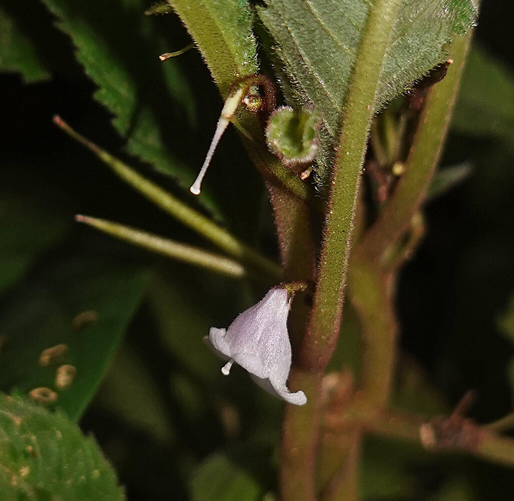 Codonoboea lilacina, small campanulate corolla, pistil and maturing pointed capsular fruits, Tahan river, Taman Negara, Malaysia