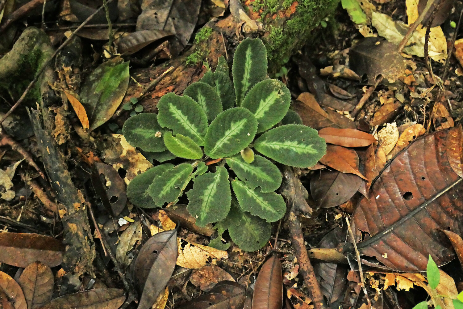 Codonoboea puncticulata, refringent silver design along the midrib, Endau Rompin NP, Malaysia