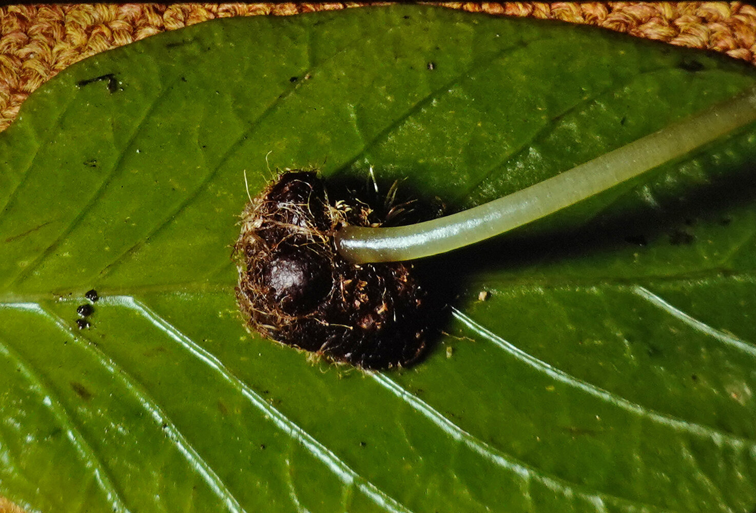 Argostemma unifolium, tuberous base of each stem producing a single foliage leaf, the tuber being probably a branched root system, Penang Hill, Malaysia