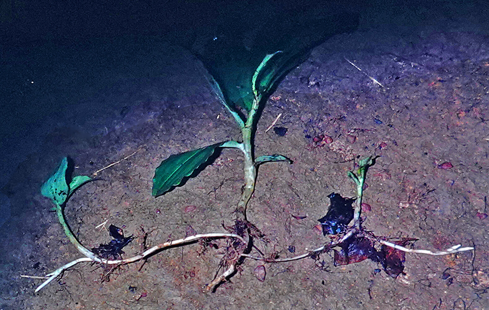 Chamaecostus curcumoides, part of stoloniferous axis producing an axillary erect bud with two swollen resting tuberous roots, Nouragues CNRS field station, French Guyana