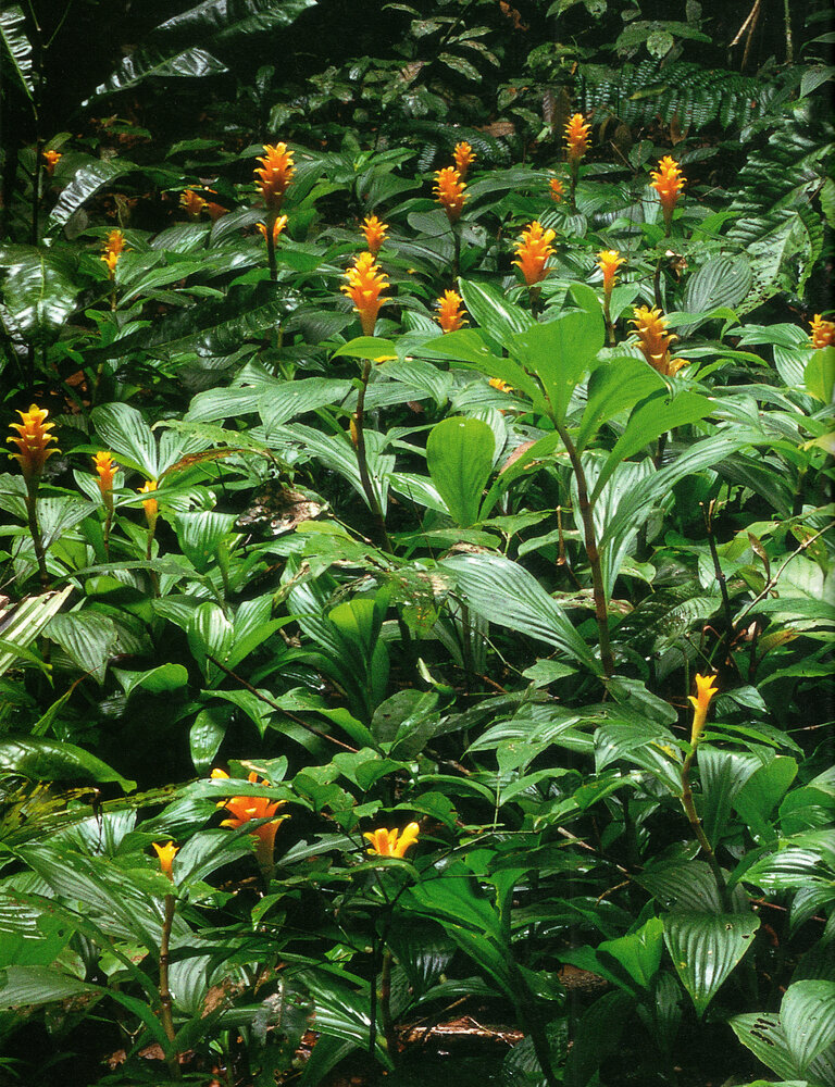 Chamaecostus curcumoides, mostly vegetative population at Nouragues, French Guyana, from the book by Patrick Blanc Etre Plante à l'ombre des forêts tropicales, Nathan Ed., Paris, 2002, Pages 374 and 375