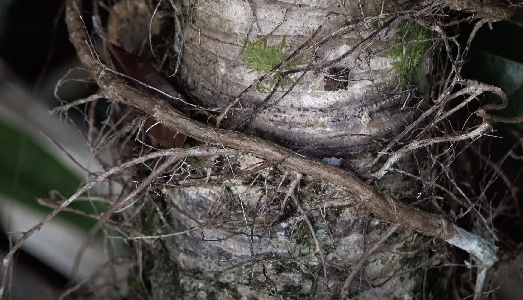 Epipremnum giganteum, freely hanging feeding roots reaching the soil, issued from the detached lateral stems, Bukit Timah NR, Singapore