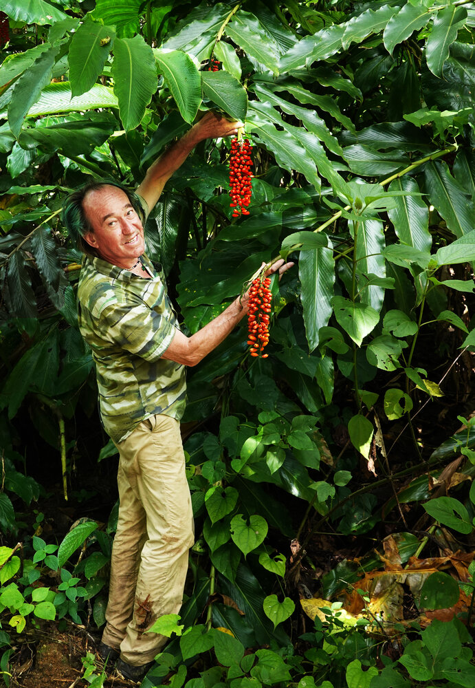 Patrick Blanc observing the mericarp fruits of a cauliflorous Goniothalamus, a small forest understory tree, Imbu Rano, Kolombangara, Solomon Islands, Sept. 2019