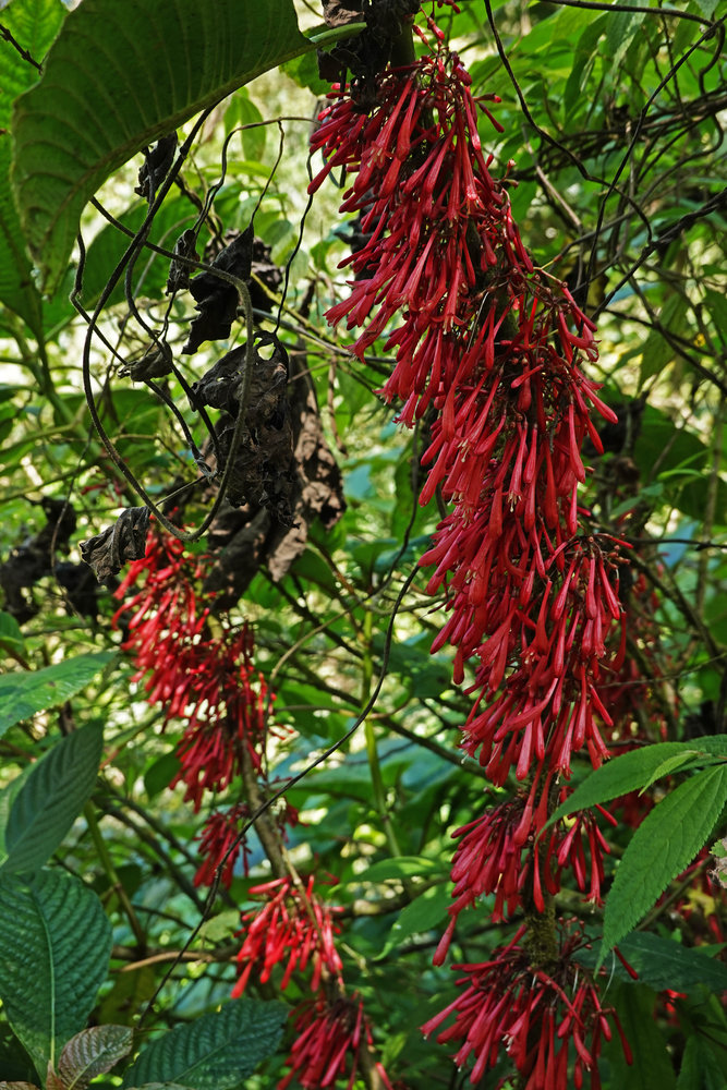 Hoffmannia cauliflora, tubular Fuchsia like flowers, probably pollinated by forest understory hummingbird species, Mirador Rey Tepepul, Lake Atitlan, Guatemala