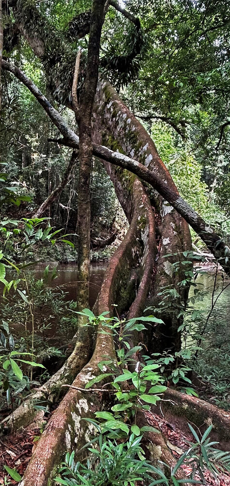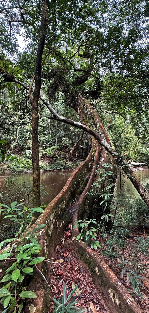 • Patrick Blanc and Pascal Héni among the long vertically flattened buttresses of Dipterocarpus oblongifolius stabilizing the horizontally bending trunk above the Tahan river, Taman Negara, Malaysia, Sept. 2025
