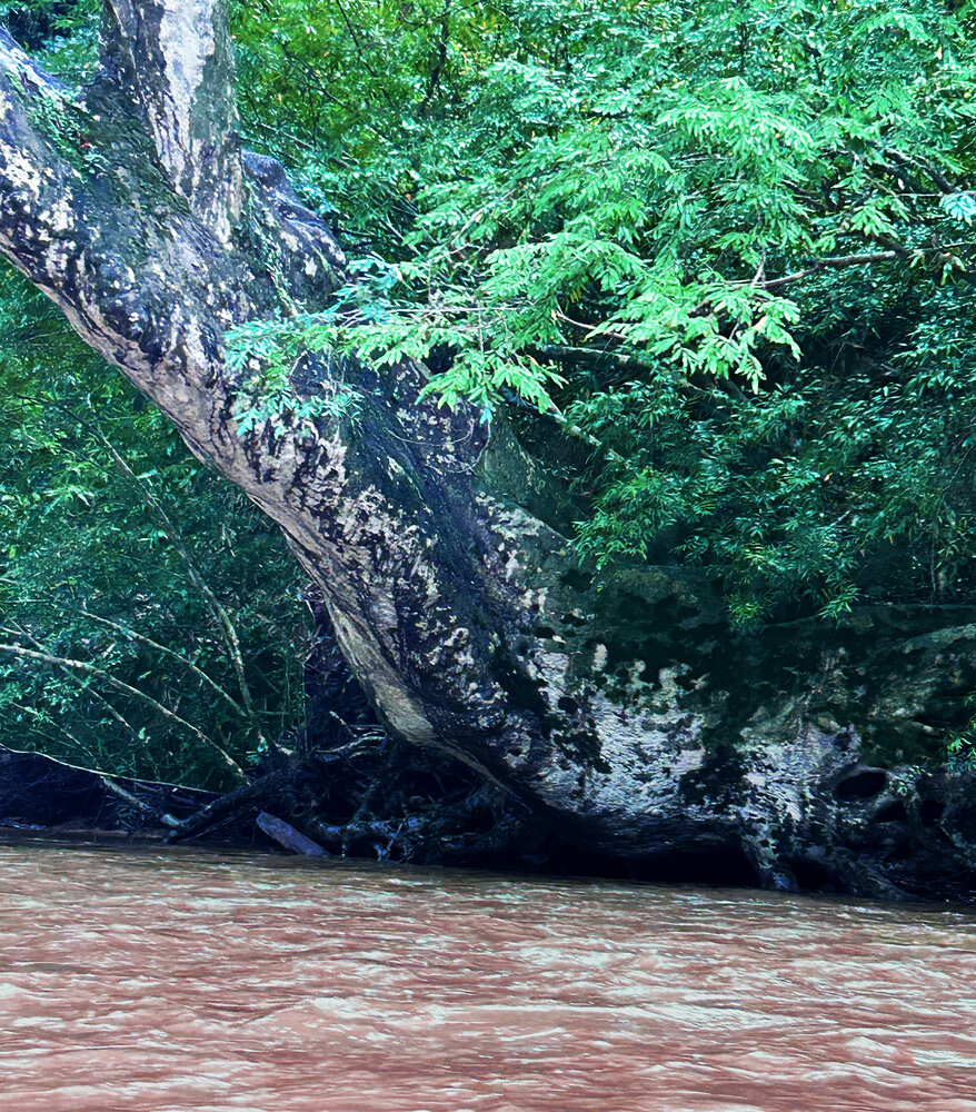 Dipterocarpus oblongifolius, this individual has a trunk bending only at about 30° but its main branch is almost horizontally exposed above the Tahan river, Taman Negara, Malaysia