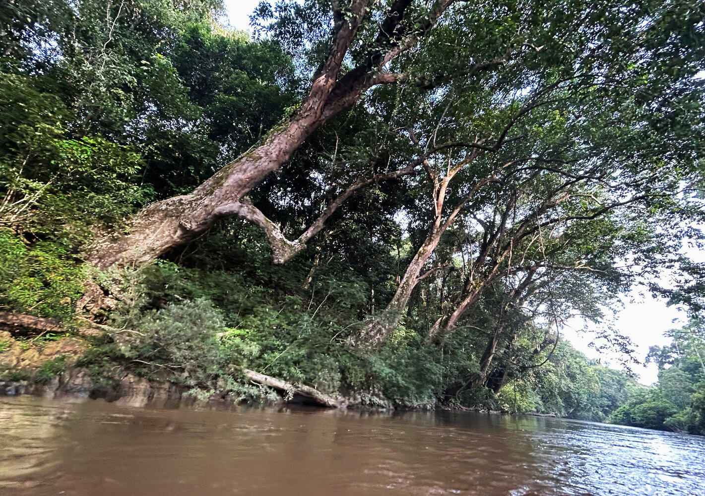 Dipterocarpus oblongifolius, the Neram, the trunks bending at 45° above Tahan river, thus creating a green tunnel, Taman Negara, Malaysia