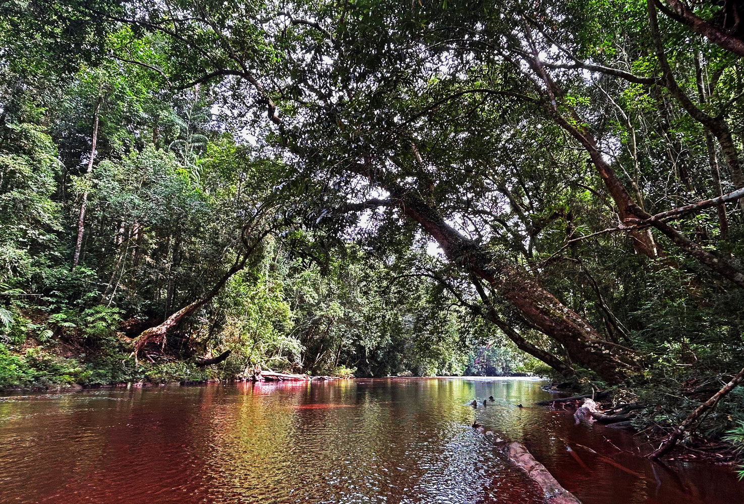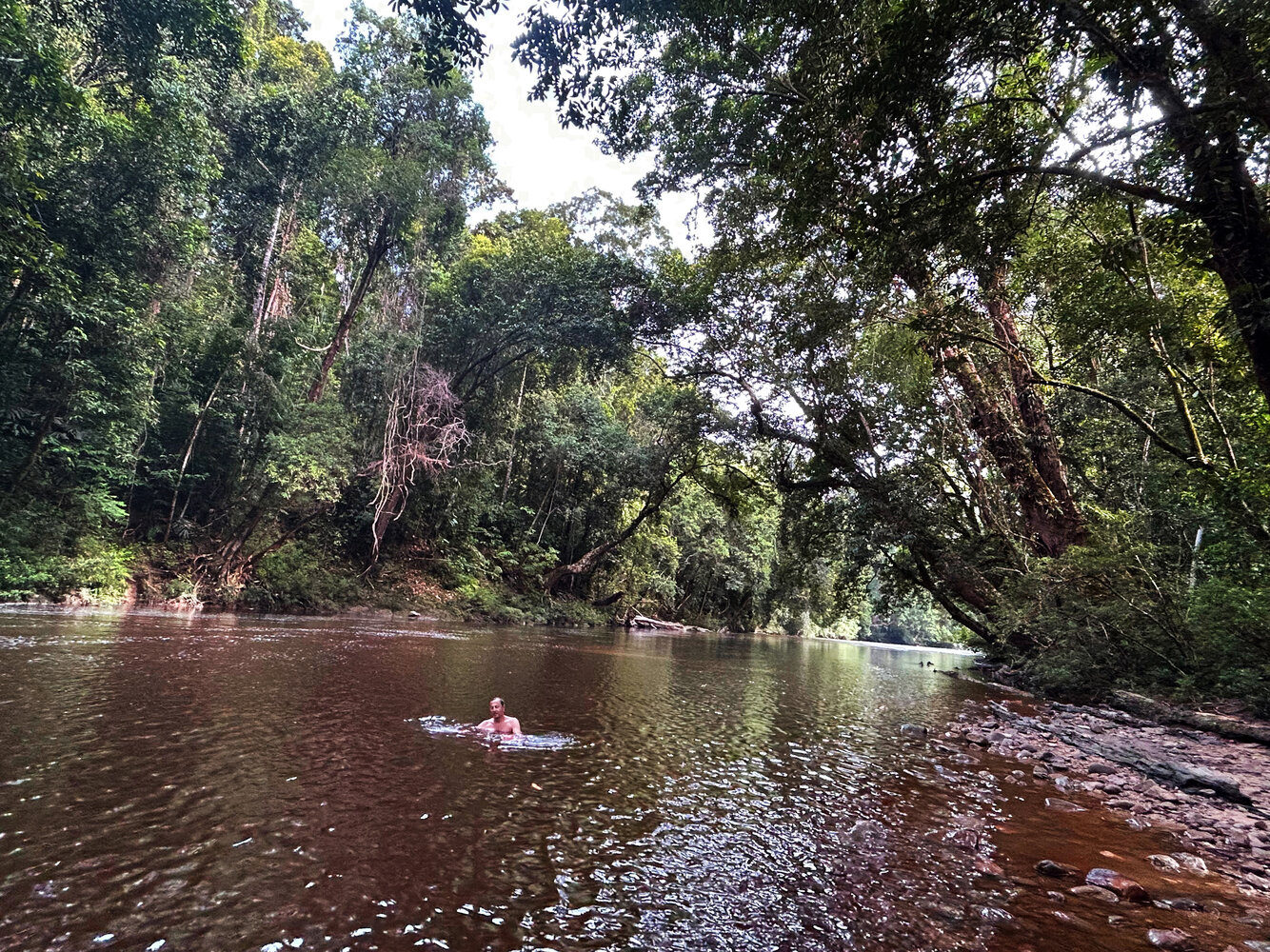 • Pascal Héni swimming in the Tahan river in the green tunnel created by the huge Dipterocarpus oblongifolius bending at 45° from the river banks, Taman Negara, Malaysia