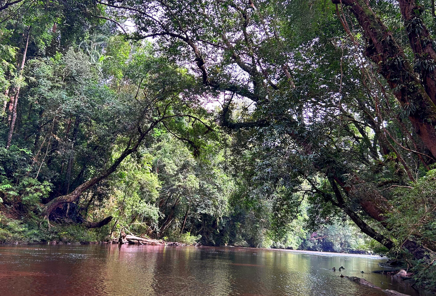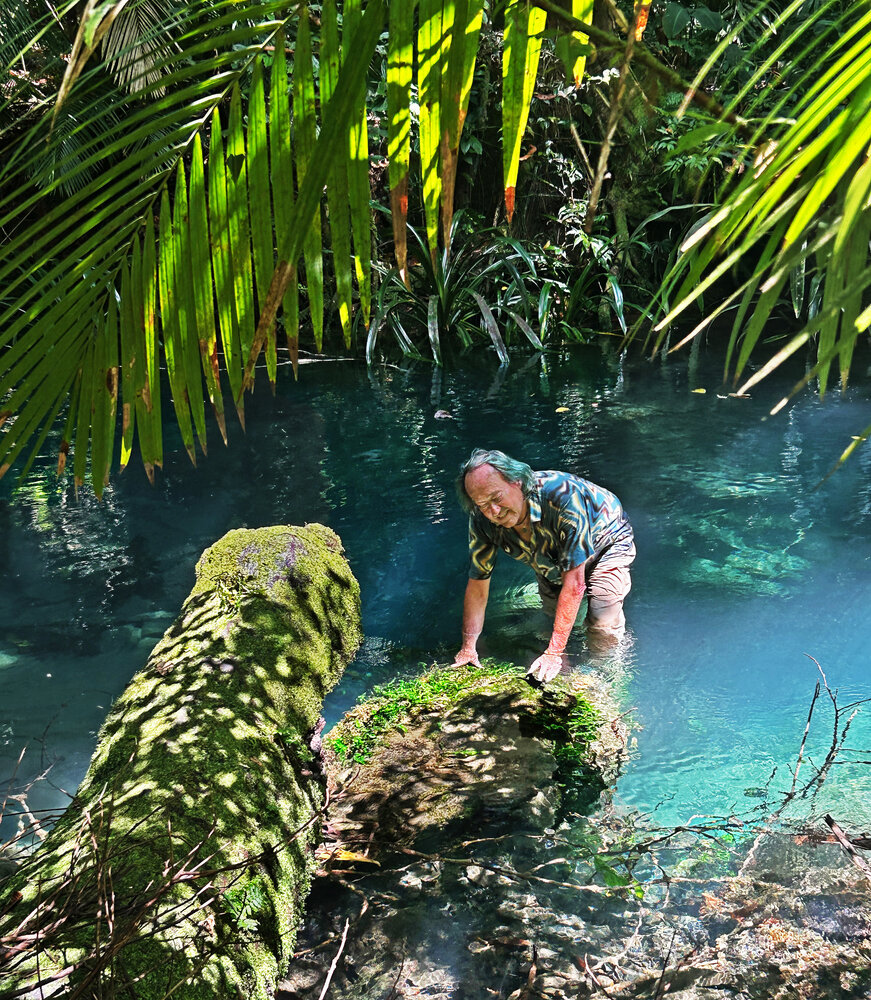 Patrick Blanc wading along the Tahan river, under the tall Neram trees, Dipterocarpus oblongifolius, totally bending above the river and creating a green tunnel, taman Negara, Malaysia, Sept. 2025