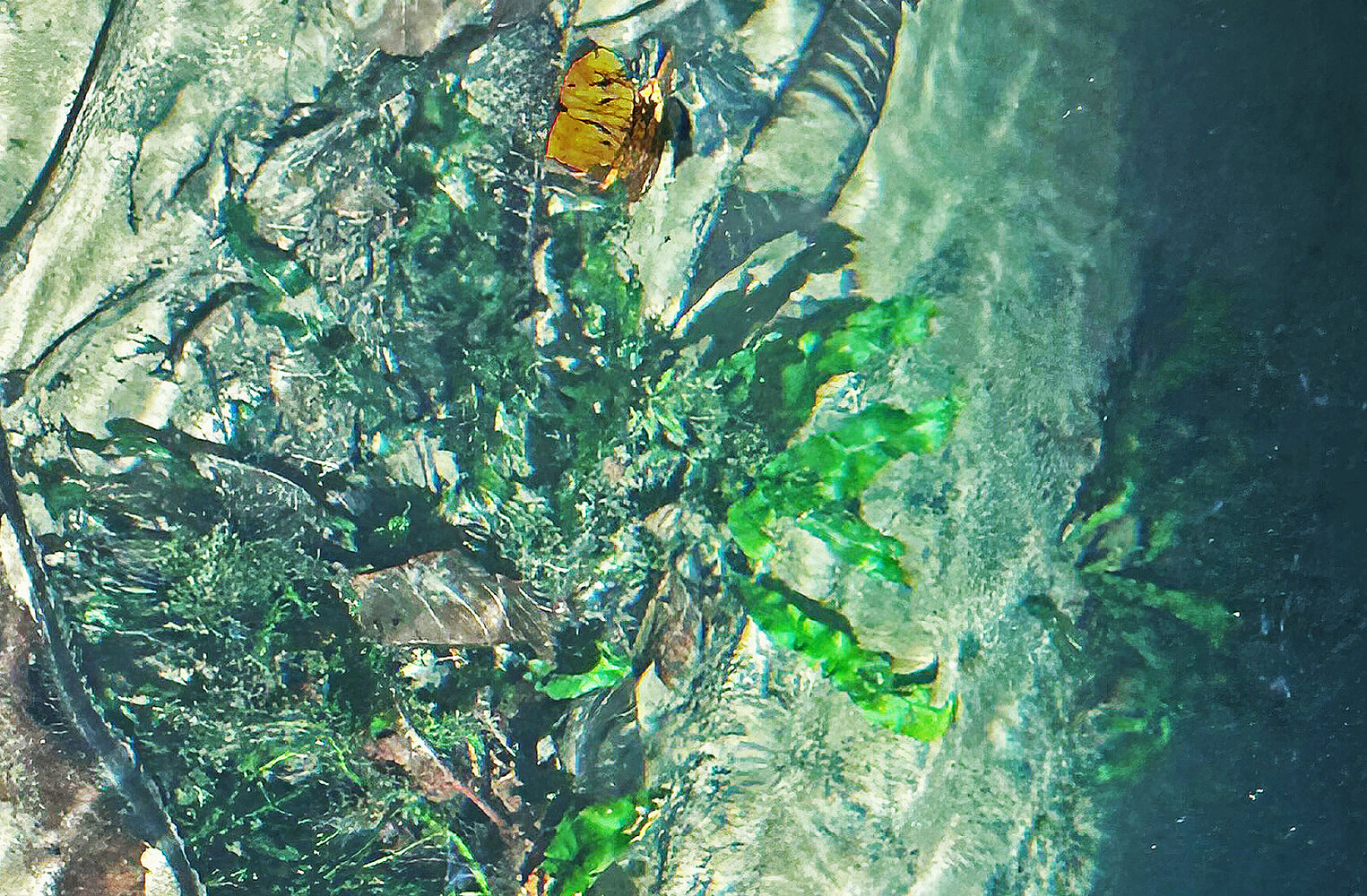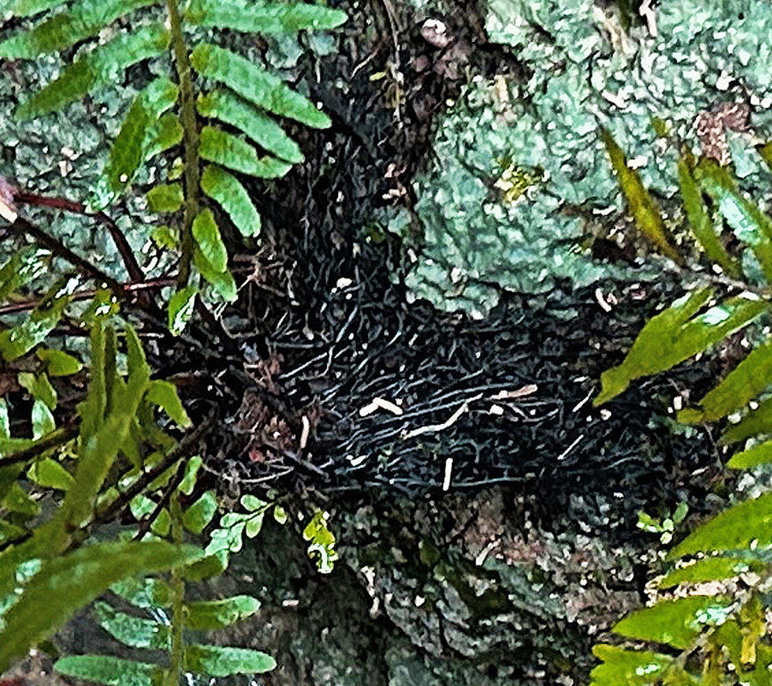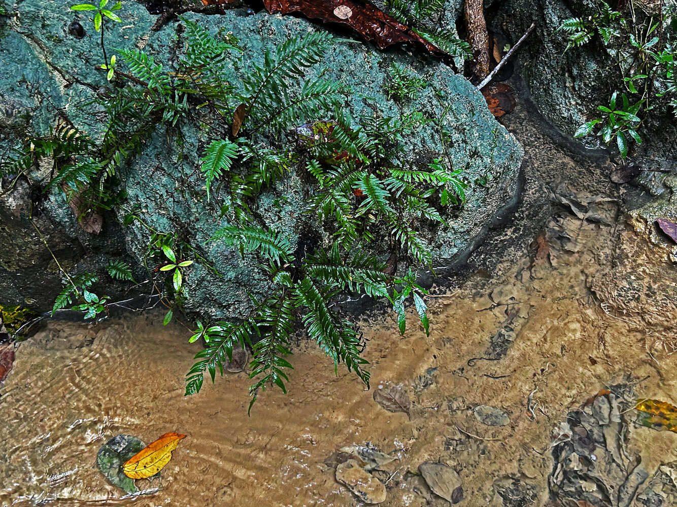 Sphaerostephanos aquatilis, blackish root system superfially but firmly fixed to the rock emerging from a forest stream, War Inkabom Waterfall, Batanta, Raja Ampat, Southwest Papua.