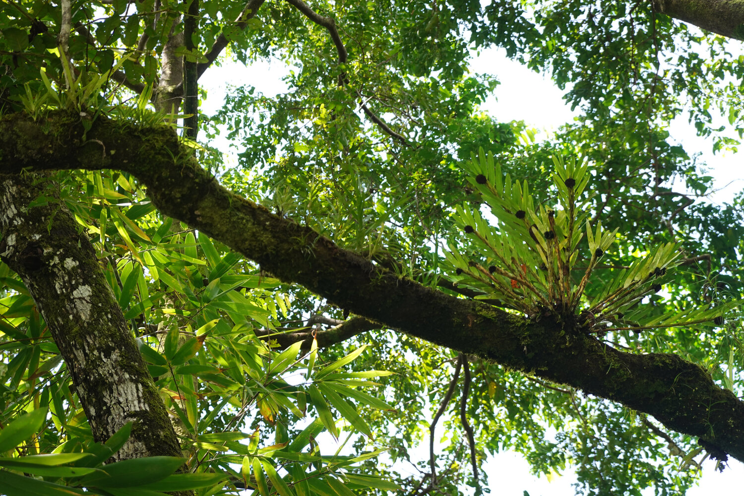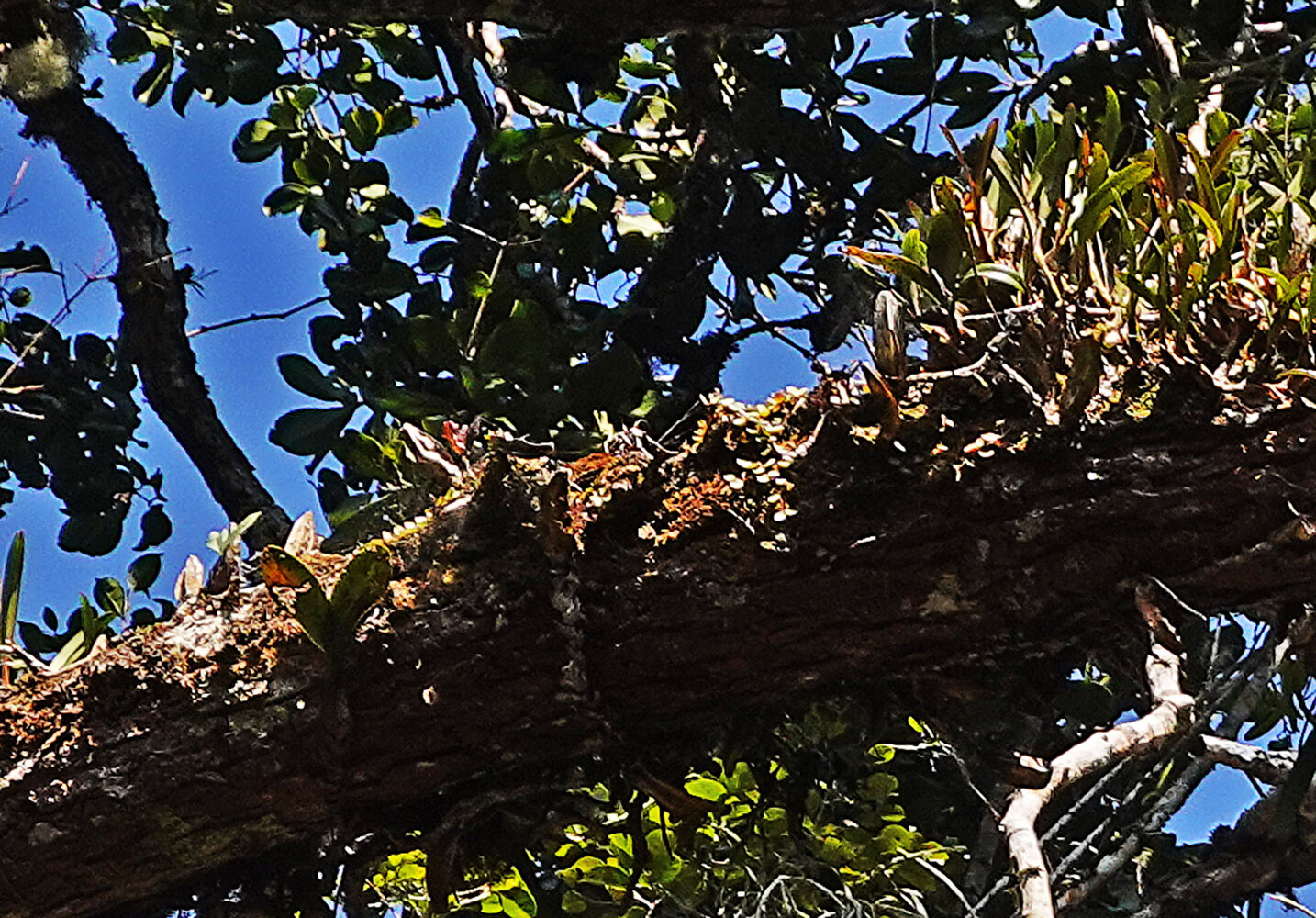 Medinilla sedifolia, Orchids, Ferns, Rhipsalis, Phlegmariurus and other epiphytes on the oblique main branches of a tree reaching about 40 m in height, Anamalazaotra NP, Madagascar
