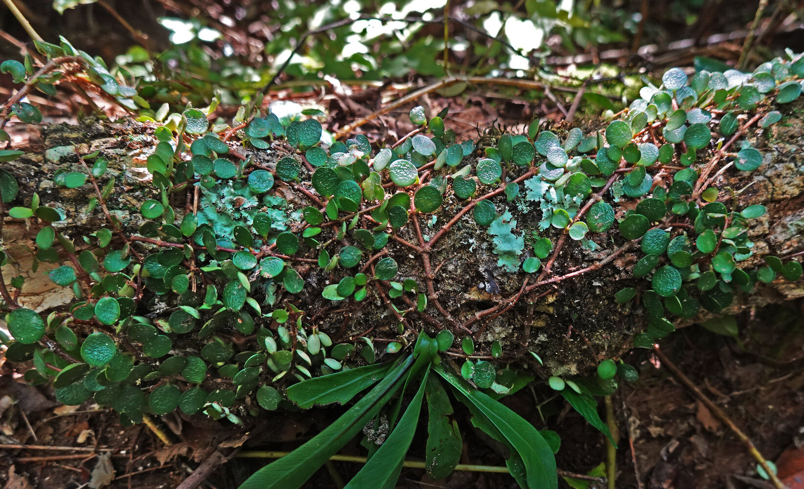 Medinilla ovalifolia as a small leaved creeper on dead leaves and mossy tree trunks, Waisali, Vanua Levu, Fiji