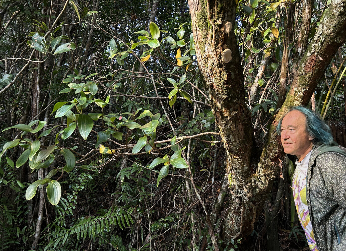 Patrick Blanc observing the branched epiphytic Medinilla cf. glomerata with swollen root system, Ankin'ny Nofy Reserve, Madagascar, Aug. 2024