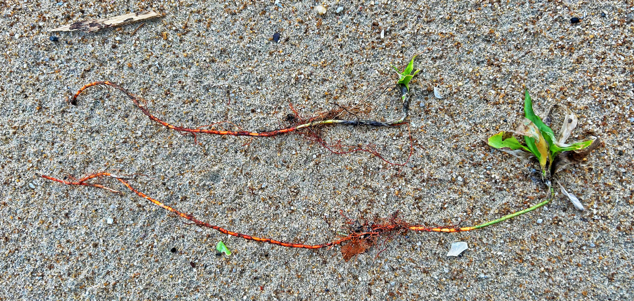 Dracaena braunii, very long bright orange stolons creeping just under the sandy soil surface and ending in a new leafy shoot, Kribi, Cameroon