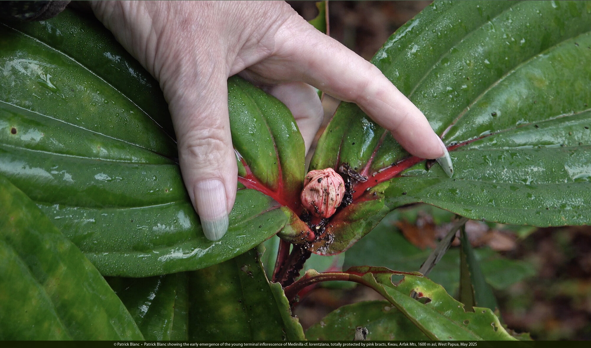 • Patrick Blanc showing the early emergence of the young terminal inflorescence of Medinilla cf. lorentziana, totally protected by pink bracts, Kwau, Arfak Mts, 1600 m asl, West Papua, May 2025
