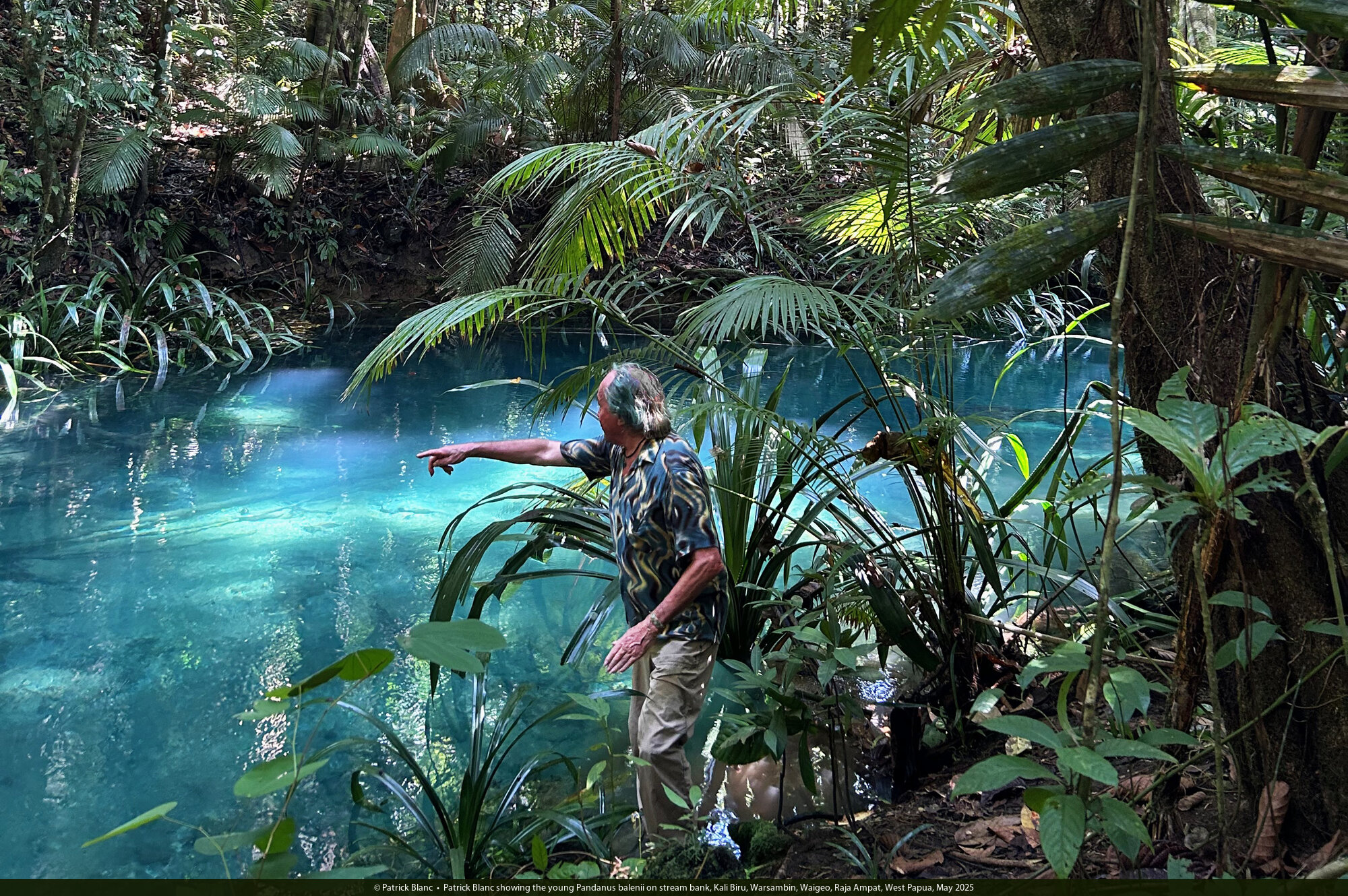 • Patrick Blanc showing the young Pandanus balenii on stream bank, Kali Biru, Warsambin, Waigeo, Raja Ampat, West Papua, May 2025