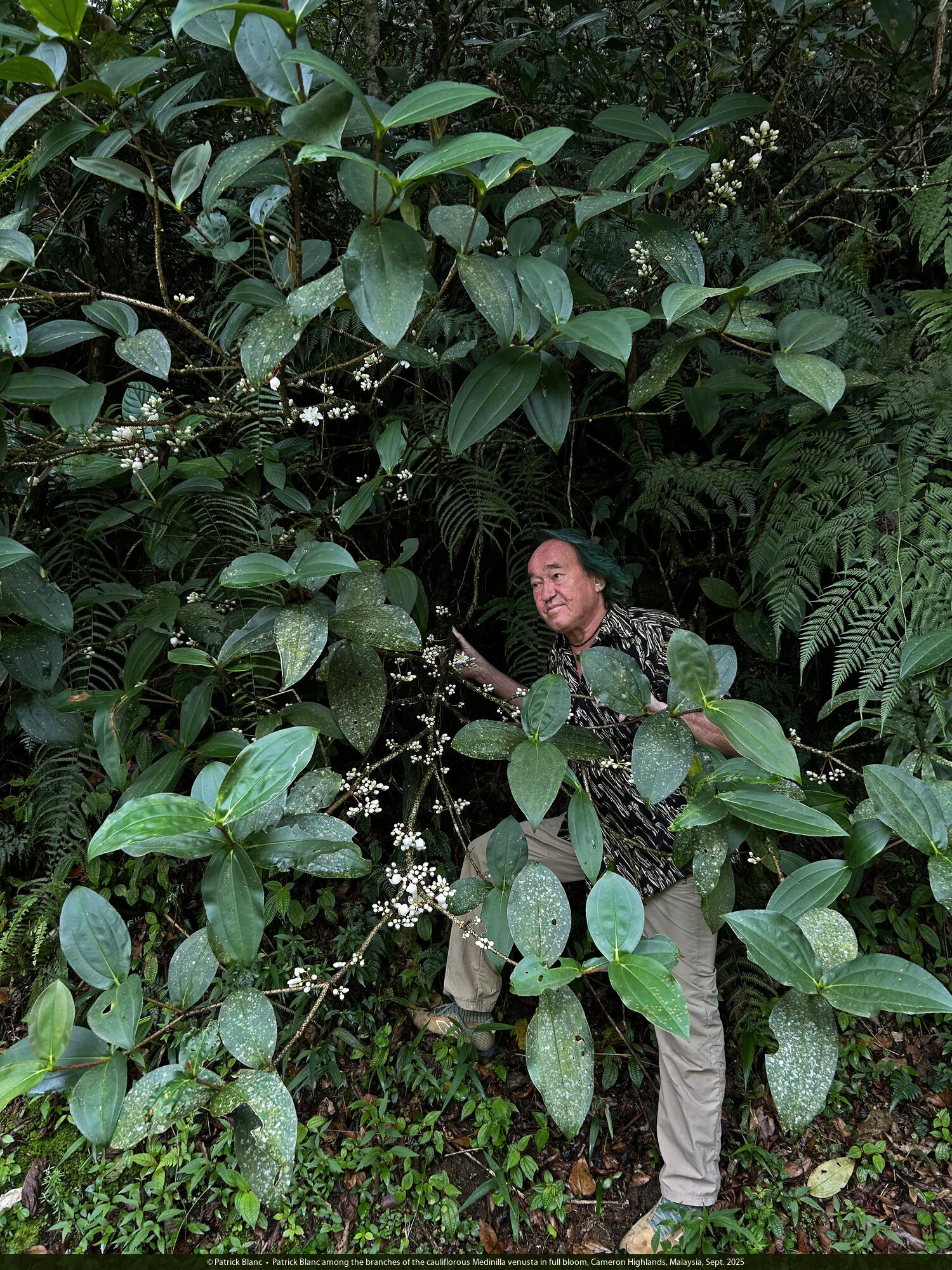 • Patrick Blanc among the branches of the cauliflorous Medinilla venusta in full bloom, Cameron Highlands, Malaysia, Sept. 2025