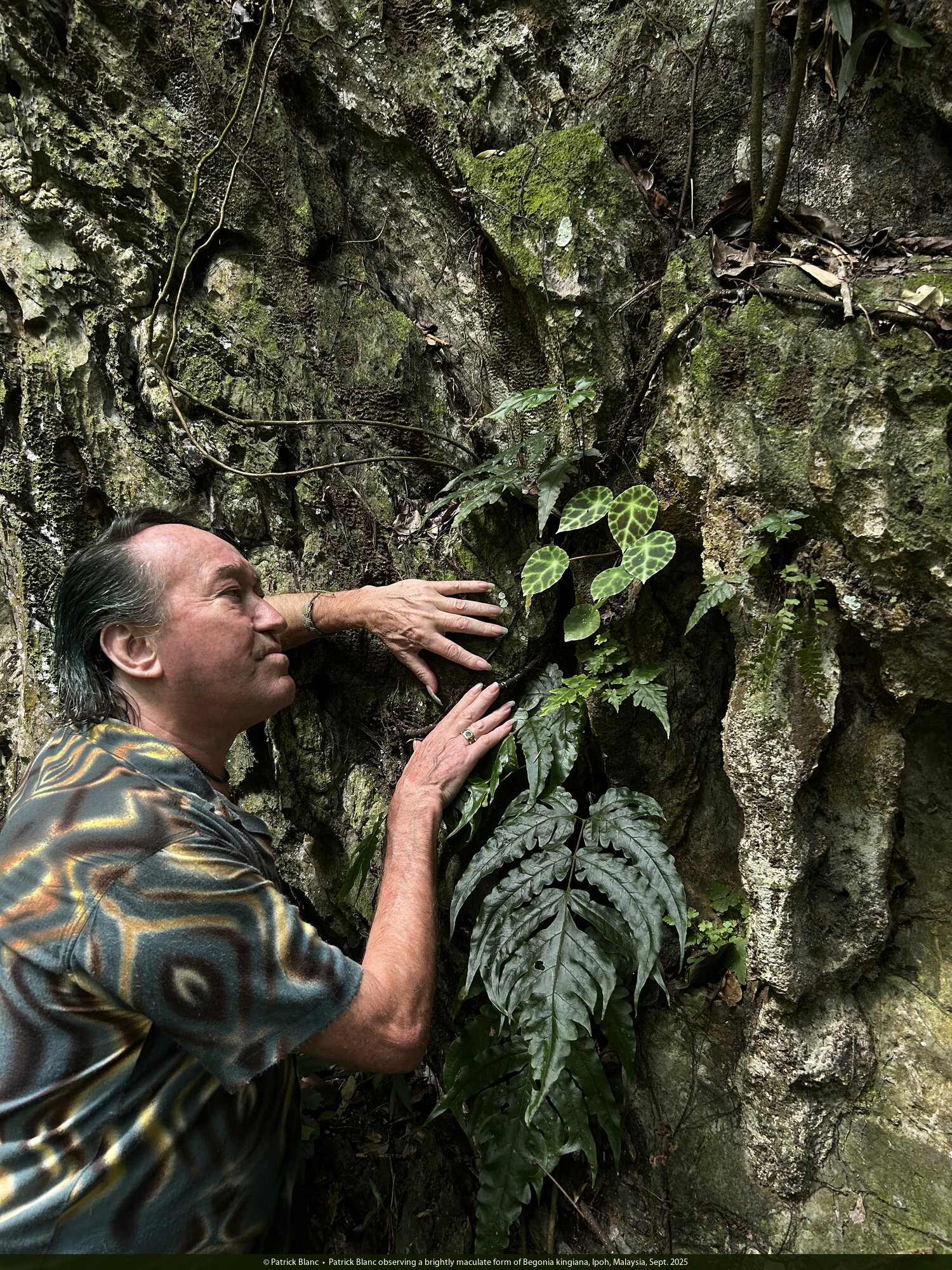 • Patrick Blanc observing a brightly maculate form of Begonia kingiana, Ipoh, Malaysia, Sept. 2025