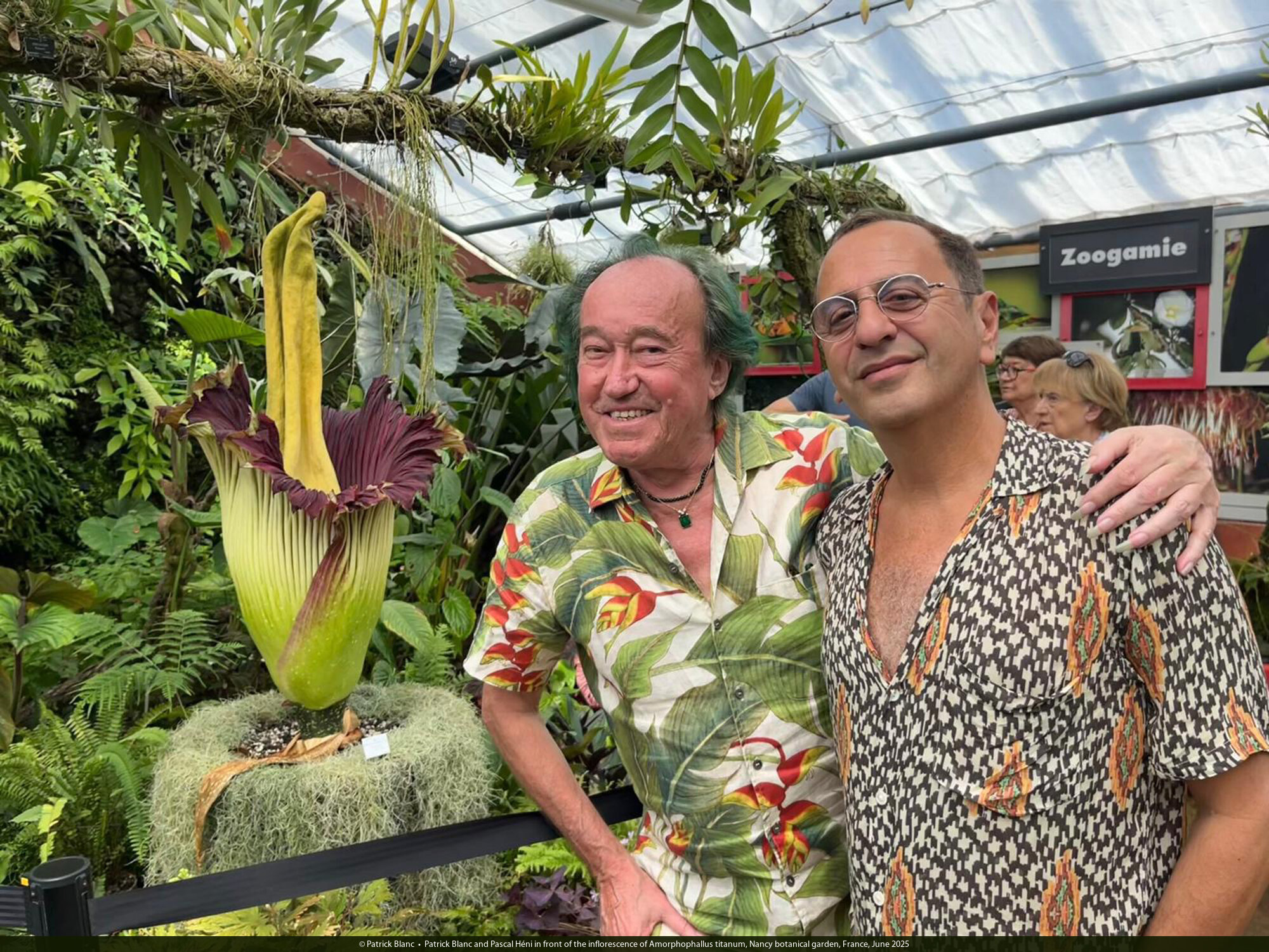 • Patrick Blanc and Pascal Héni in front of the inflorescence of Amorphophallus titanum, Nancy botanical garden, France, June 2025