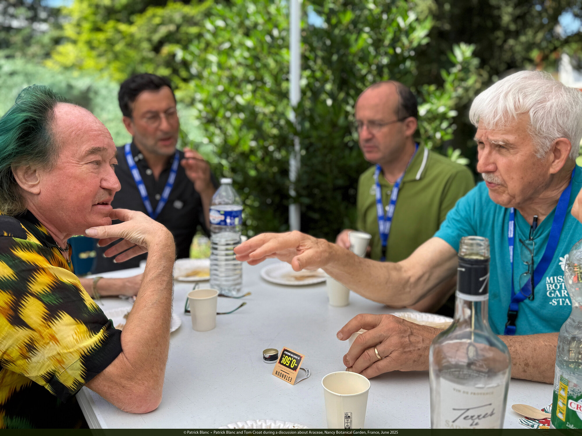 • Patrick Blanc and Tom Croat during a discussion about Araceae, Nancy Botanical Garden, France, June 2025