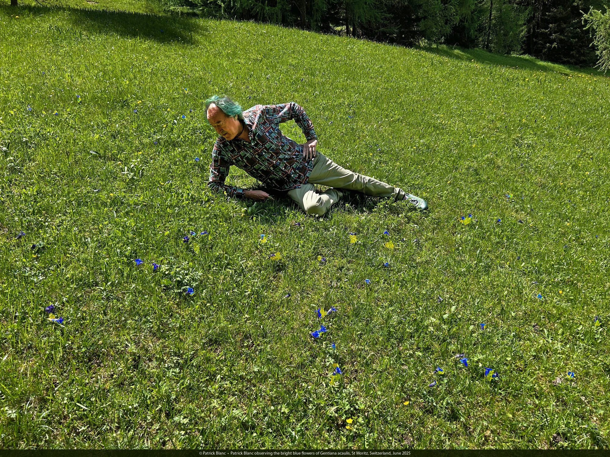 • Patrick Blanc observing the bright blue flowers of Gentiana acaulis, St Moritz, Switzerland, June 2025