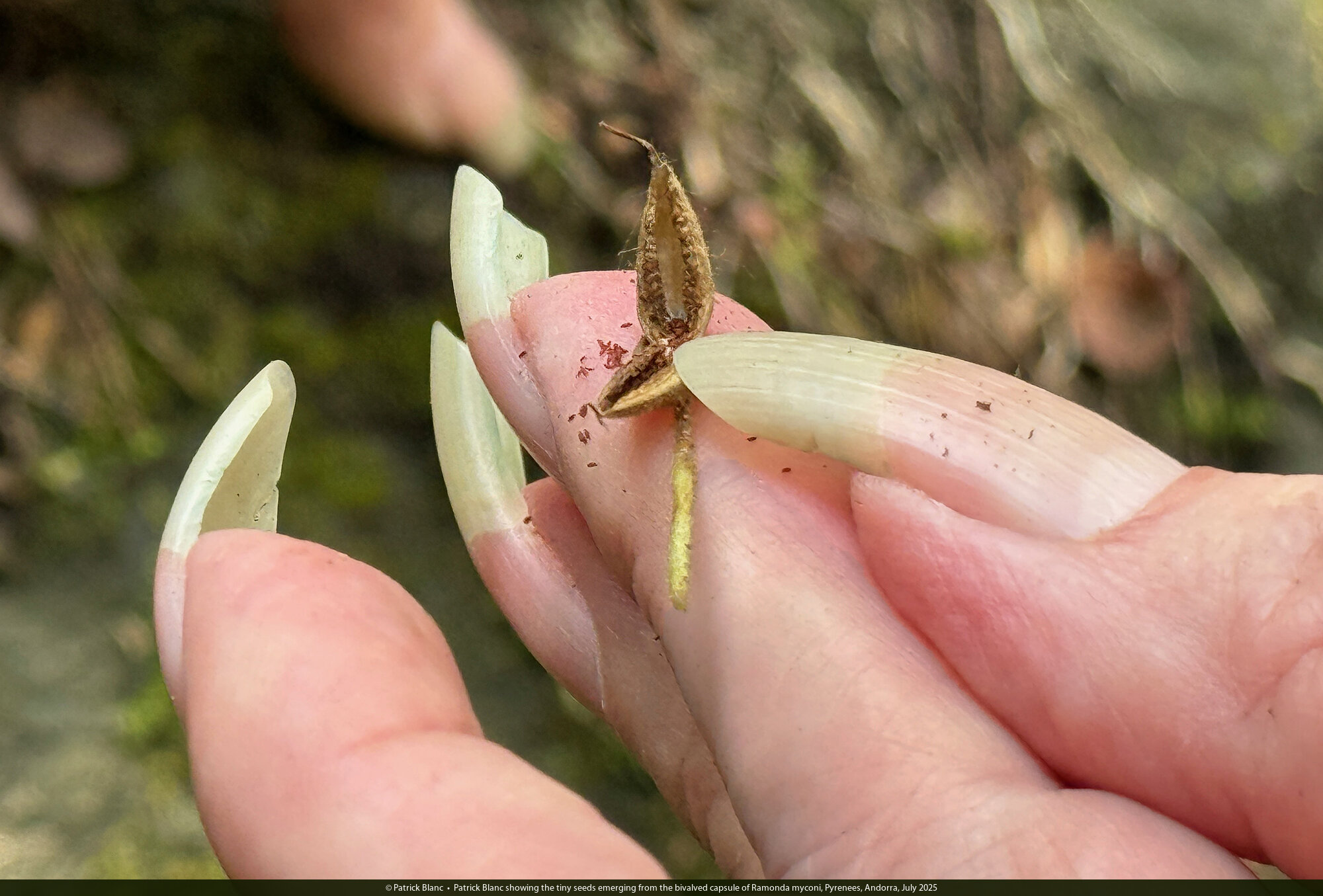 • Patrick Blanc showing the tiny seeds emerging from the bivalved capsule of Ramonda myconi, Pyrenees, Andorra, July 2025