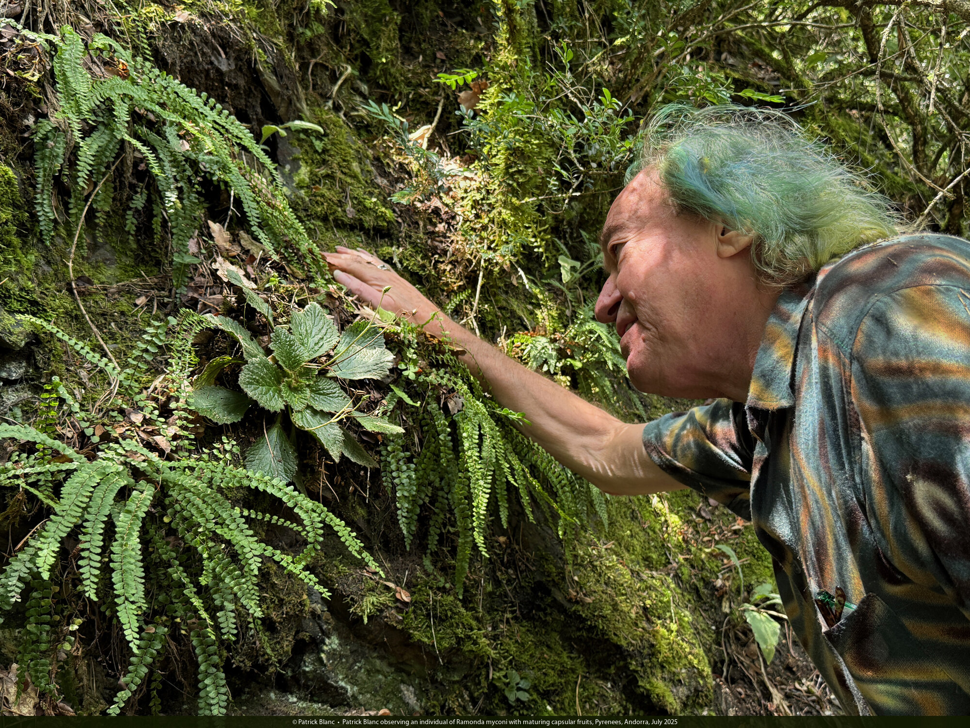 • Patrick Blanc observing an individual of Ramonda myconi with maturing capsular fruits, Pyrenees, Andorra, July 2025