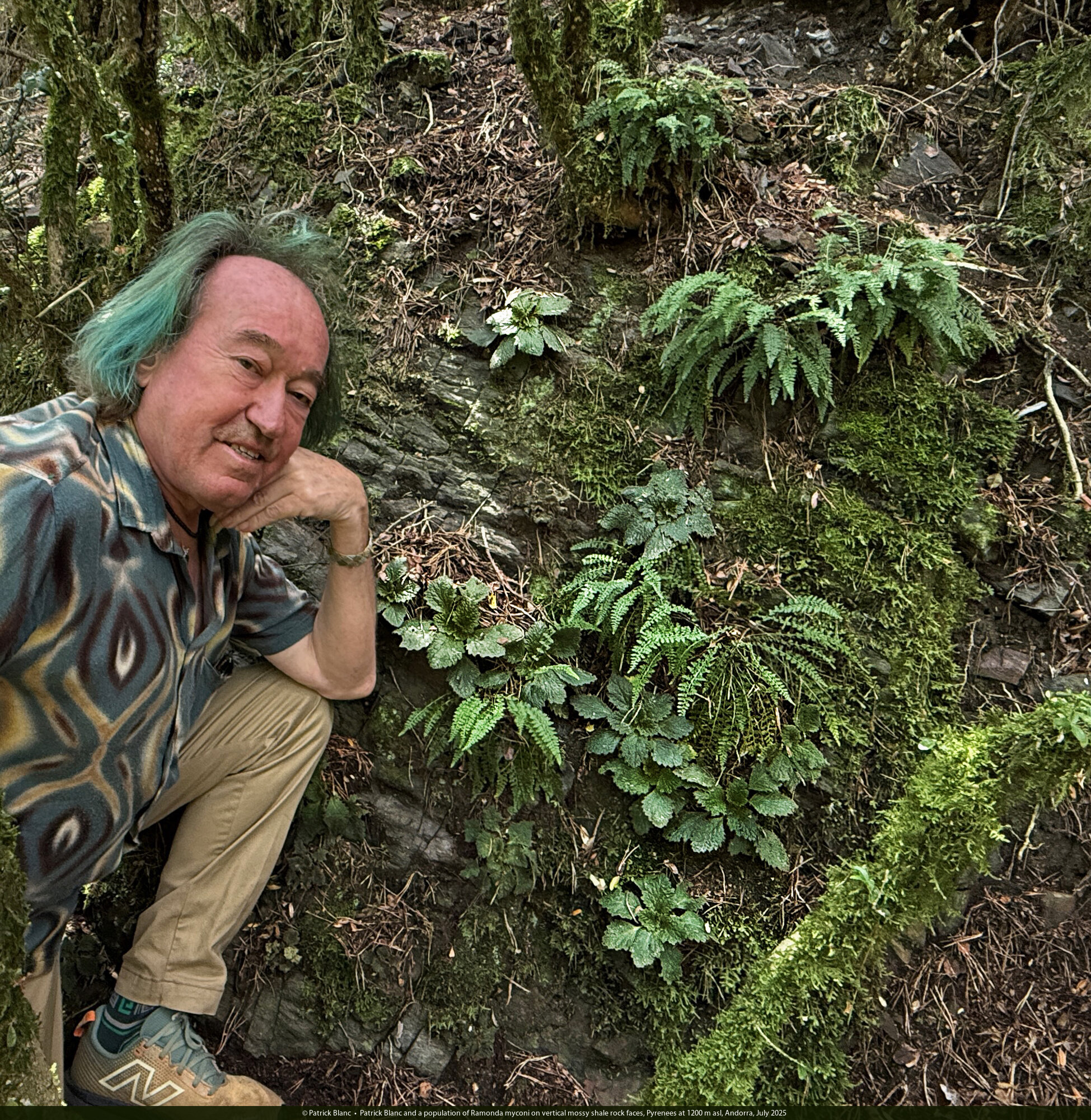 • Patrick Blanc and a population of Ramonda myconi on vertical mossy shale rock faces, Pyrenees at 1200 m asl, Andorra, July 2025