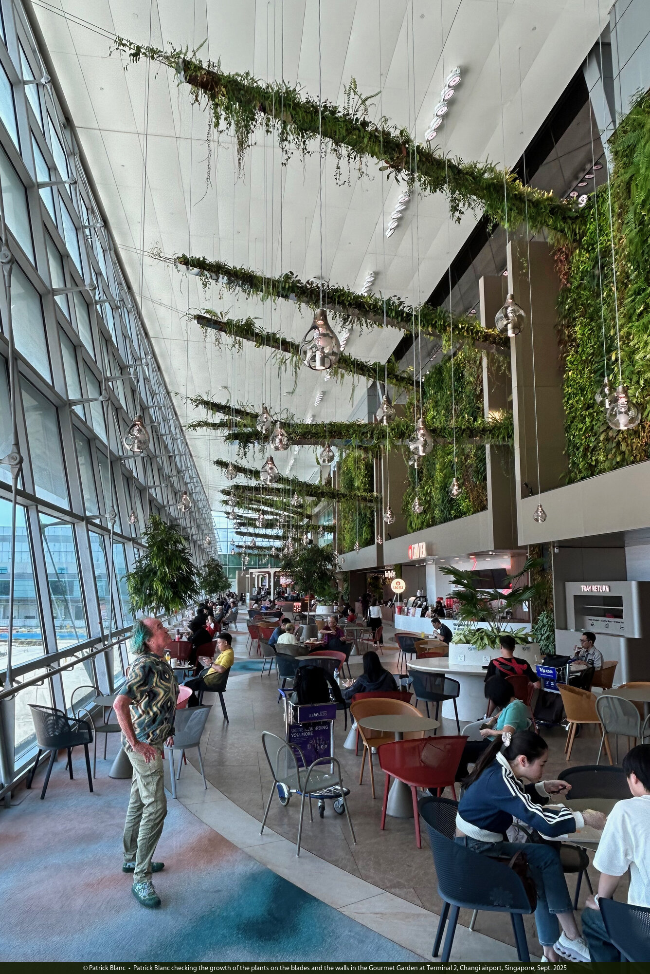 • Patrick Blanc checking the growth of the plants on the blades and the walls in the Gourmet Garden at Terminal 2, Changi airport, Singapore, Sept. 2025