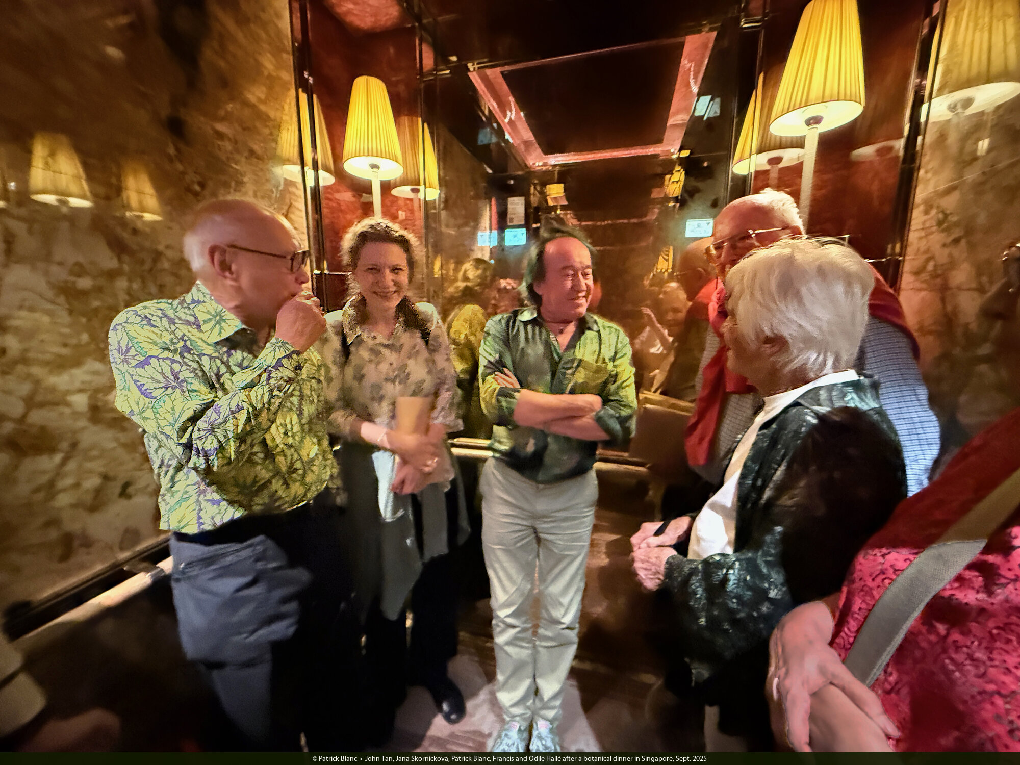 • John Tan, Jana Skornickova, Patrick Blanc, Francis Hallé and Odile Hallé after a botanical dinner in Singapore, Sept. 2025